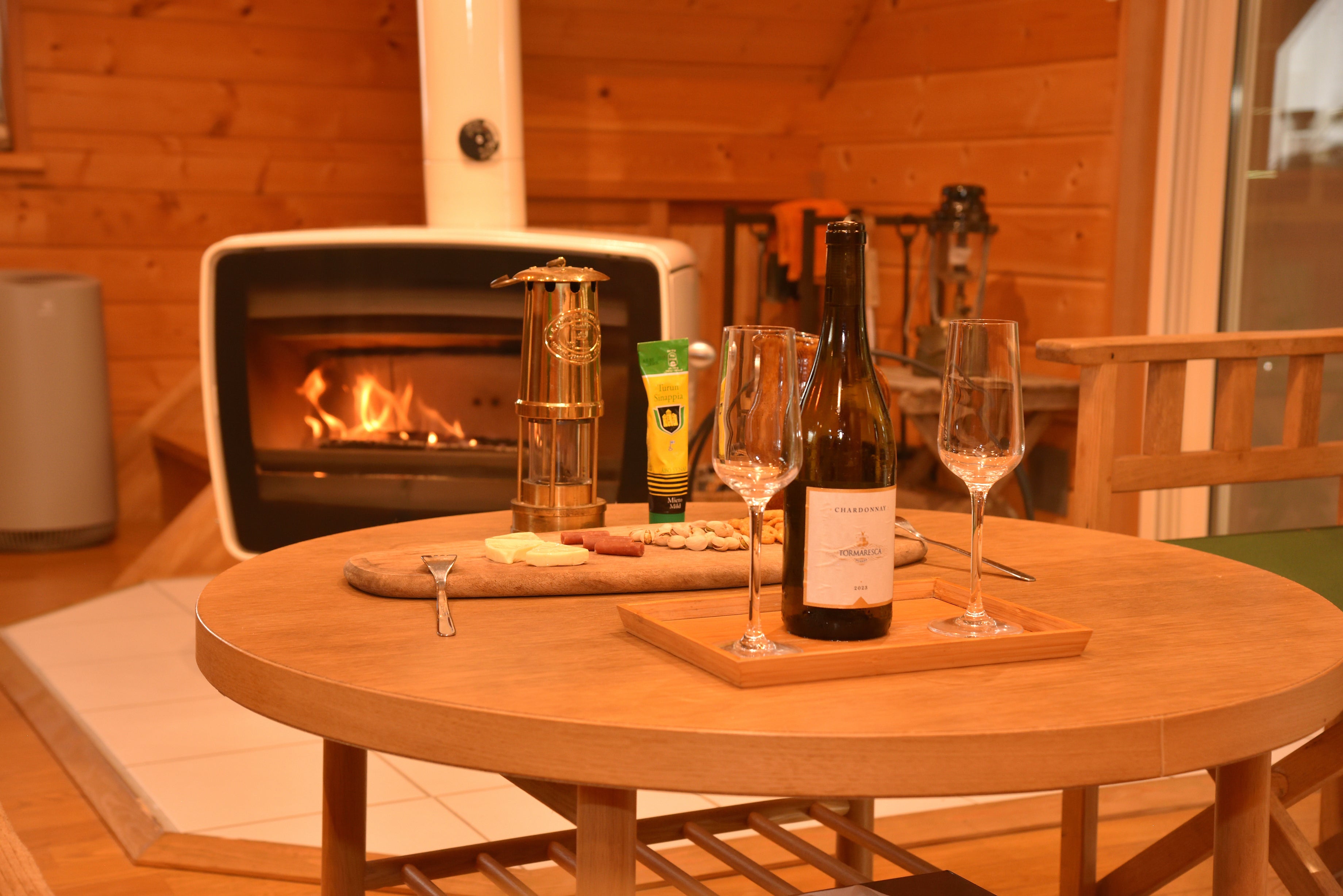 サウナの後は、薪ストーブの火を見ながら温かいご飯とお酒で乾杯。ウッドデッキではBBQも楽しめます。