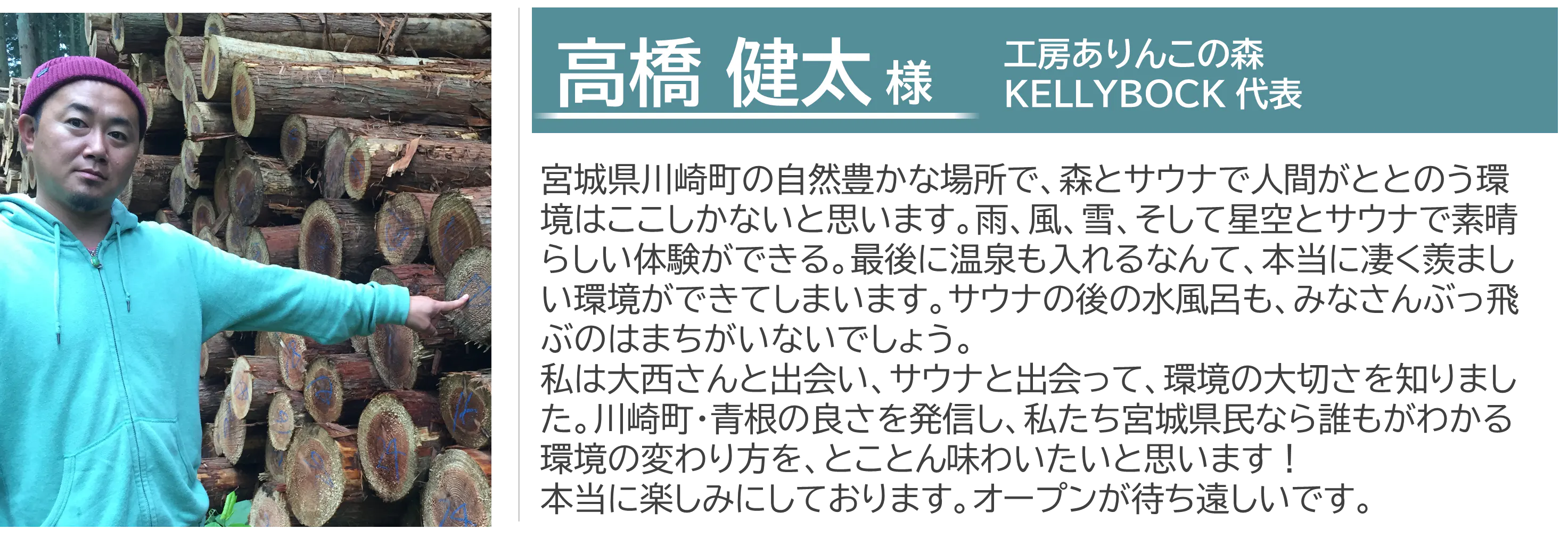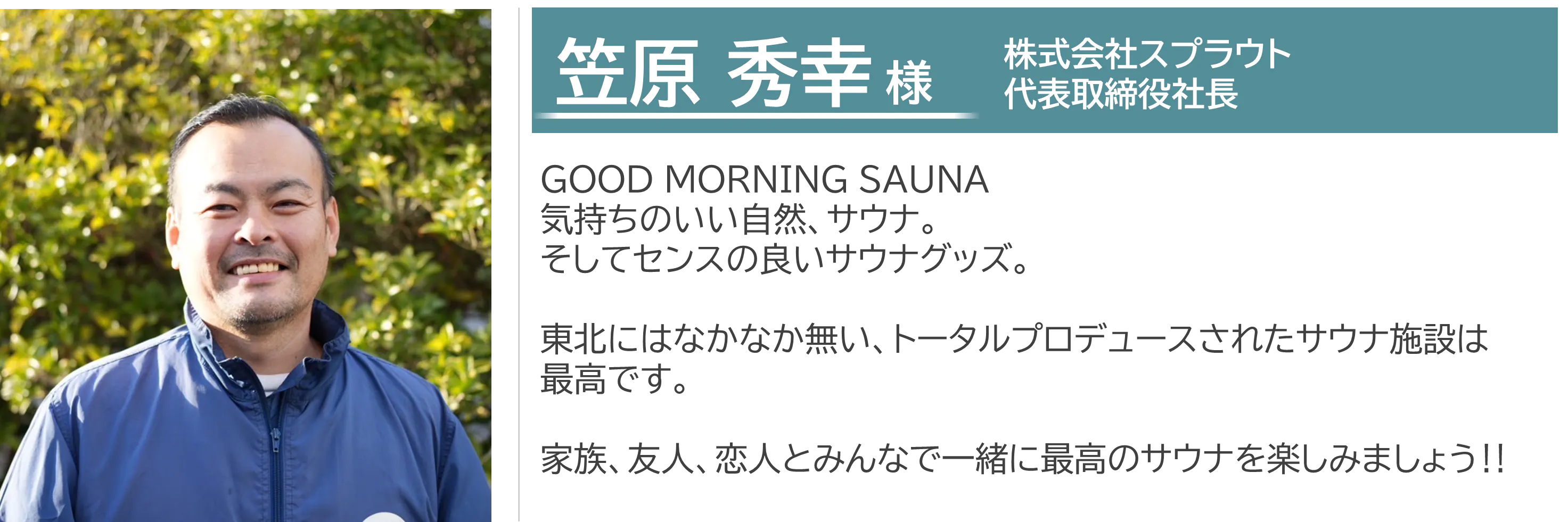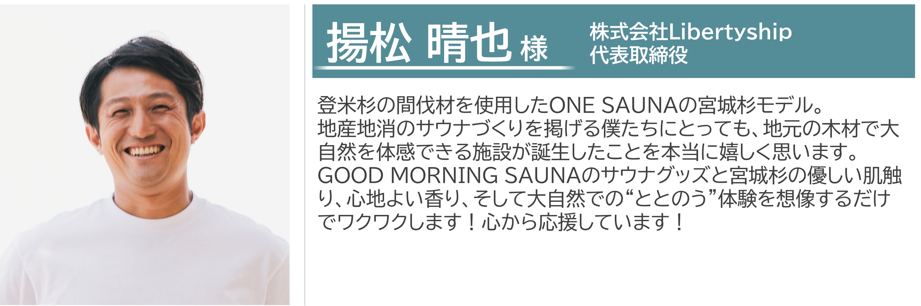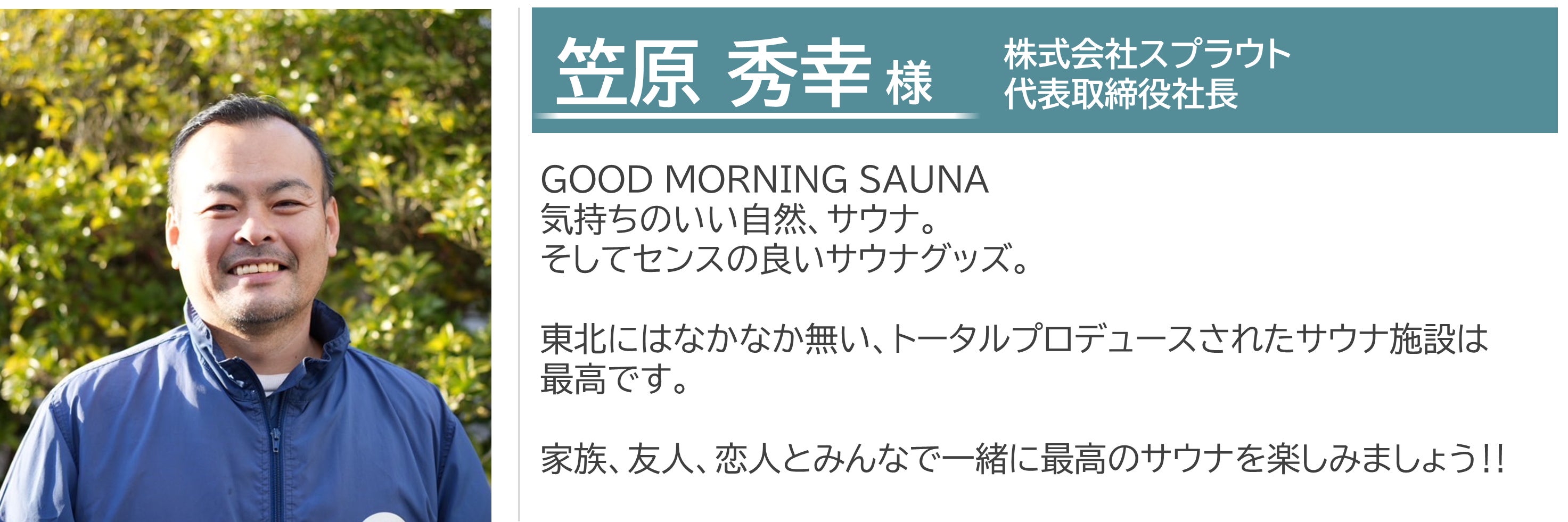 「東北は冬になると遊びが限られる」というお声がよく聞かれますが、サウナは冬にこそ本領発揮します。今後は青根を拠点に、エアストリームサウナやツリーハウスサウナなど拡大し、サウナを通して色んな方々と繋がり、たくさんのコラボレーションを行っていきながら、皆さんと一緒に地元宮城を盛り上げていきたいと思います。