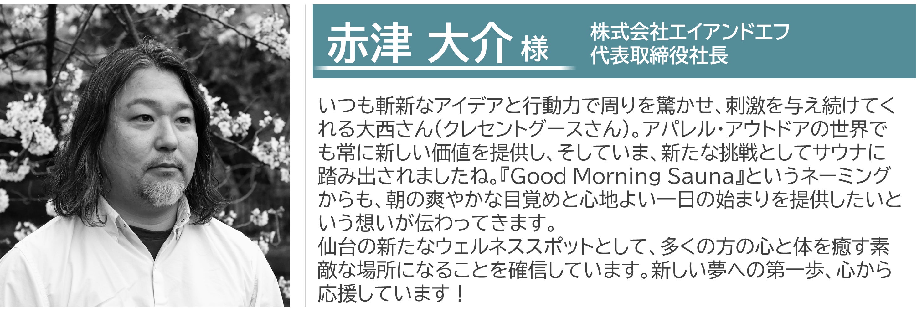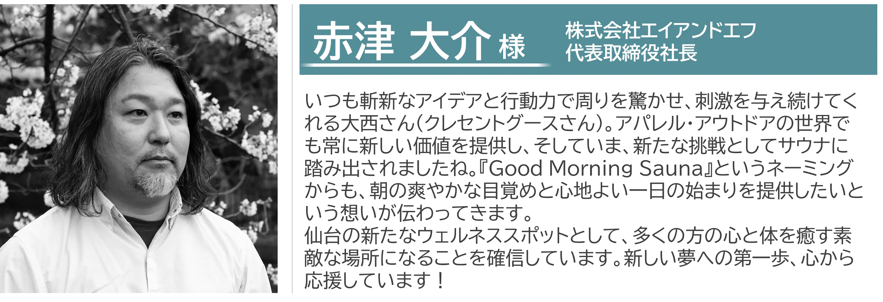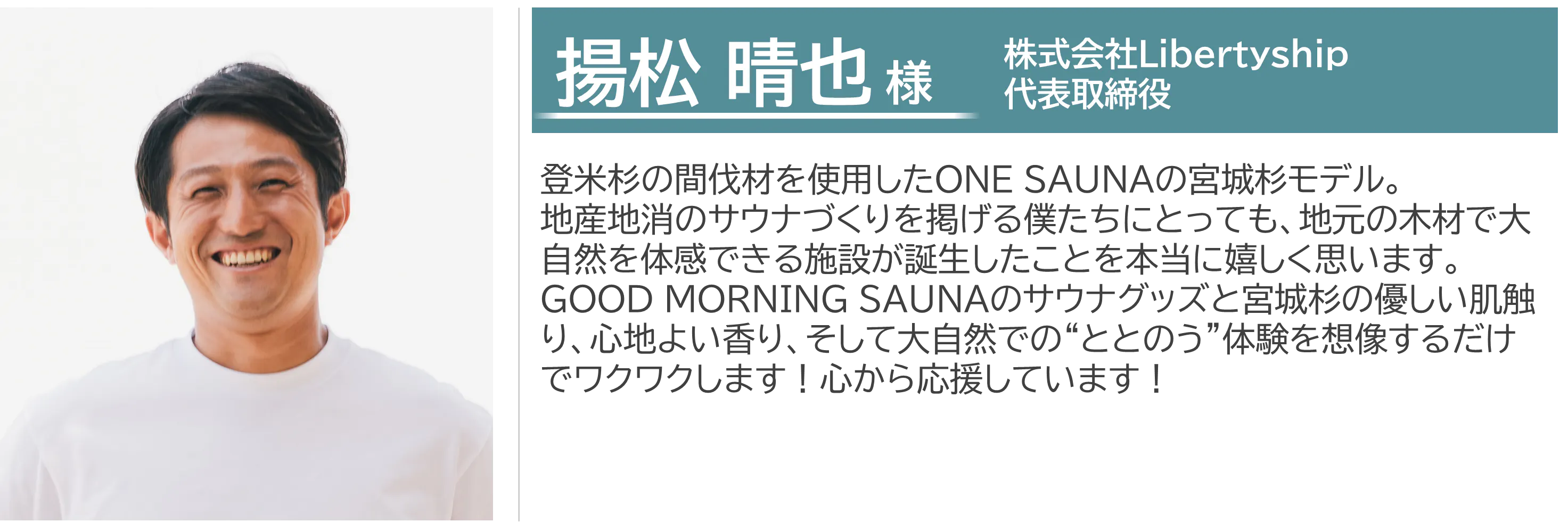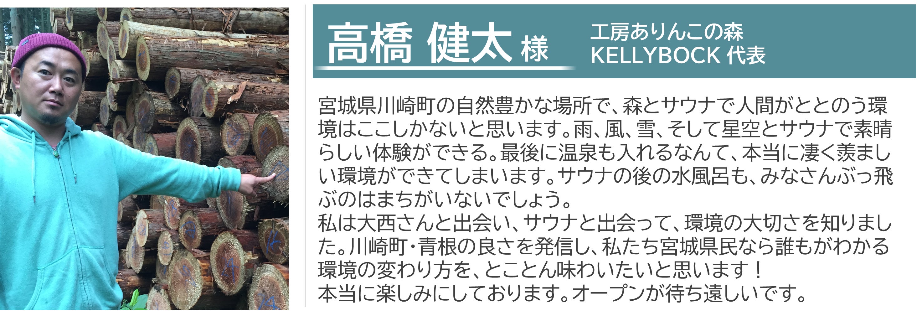 「東北は冬になると遊びが限られる」というお声がよく聞かれますが、サウナは冬にこそ本領発揮します。今後は青根を拠点に、エアストリームサウナやツリーハウスサウナなど拡大し、サウナを通して色んな方々と繋がり、たくさんのコラボレーションを行っていきながら、皆さんと一緒に地元宮城を盛り上げていきたいと思います。