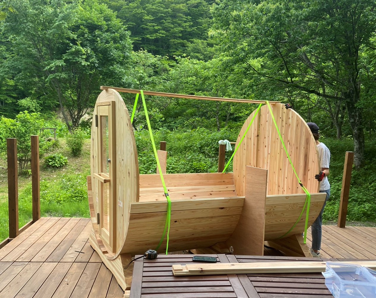 コテージに設置したバレルサウナは、新たに開発しました。「宮城の間伐材でサウナを作りたい!」という想いを持っていた私は、「ONE SAUNA」(宮崎県)の揚末代表に相談し、登米杉の間伐材を使用した全て宮城県産のバレルサウナを作ることができました。
