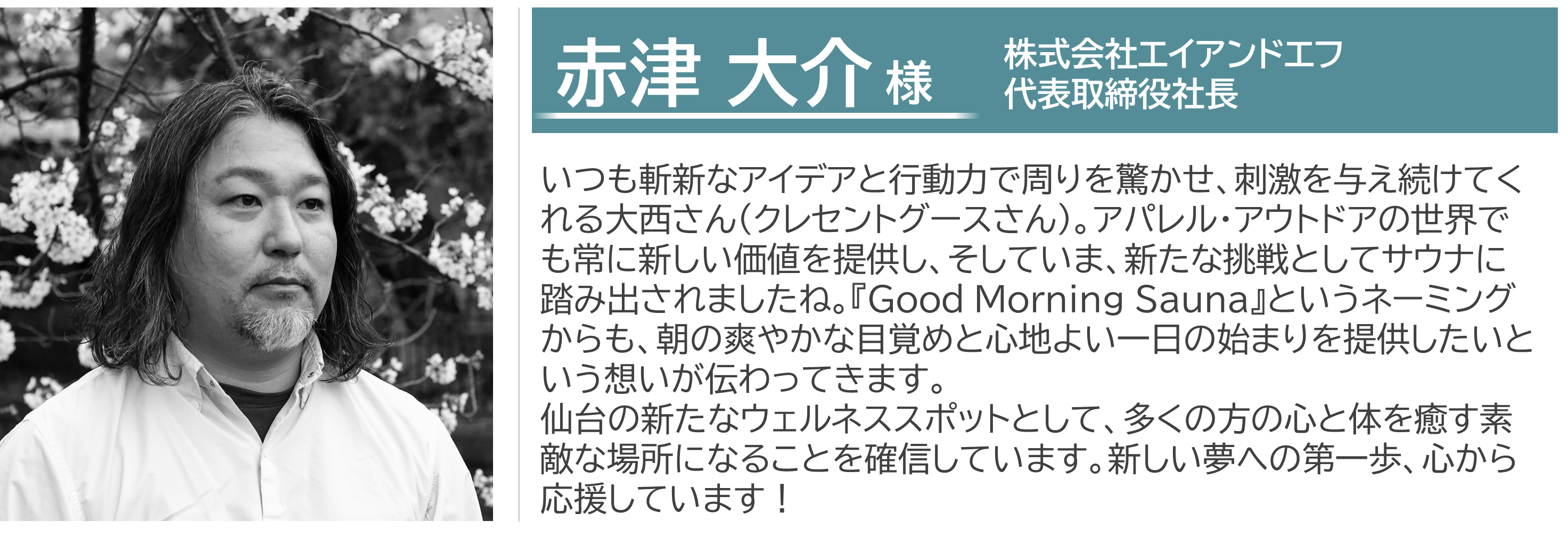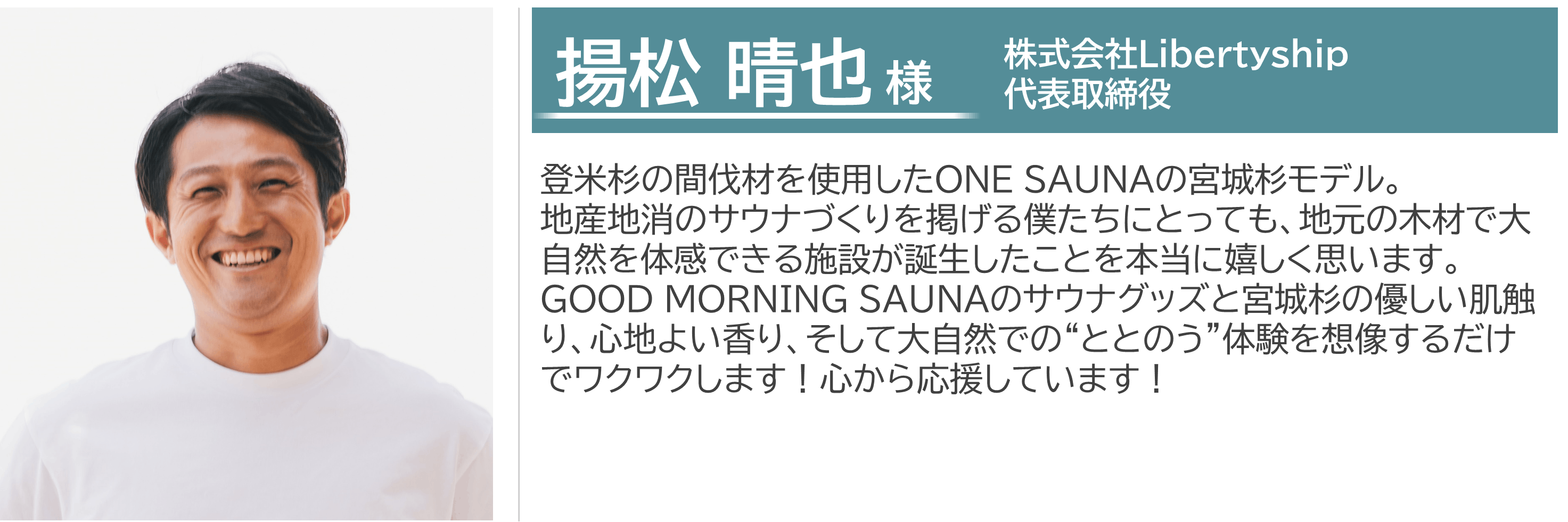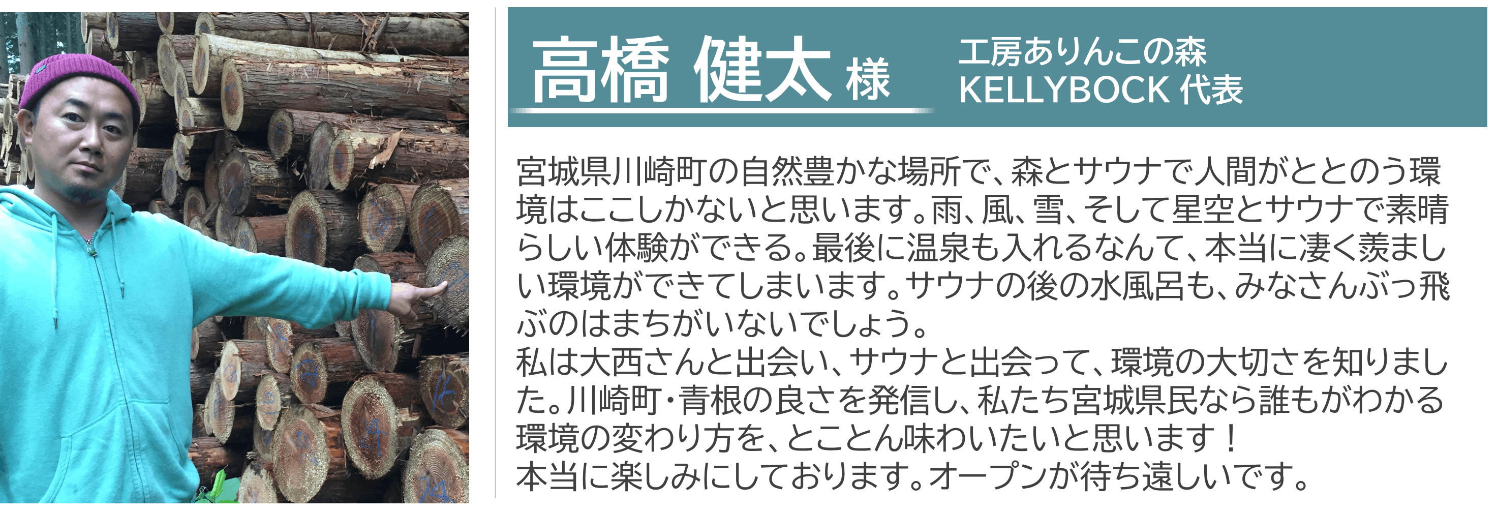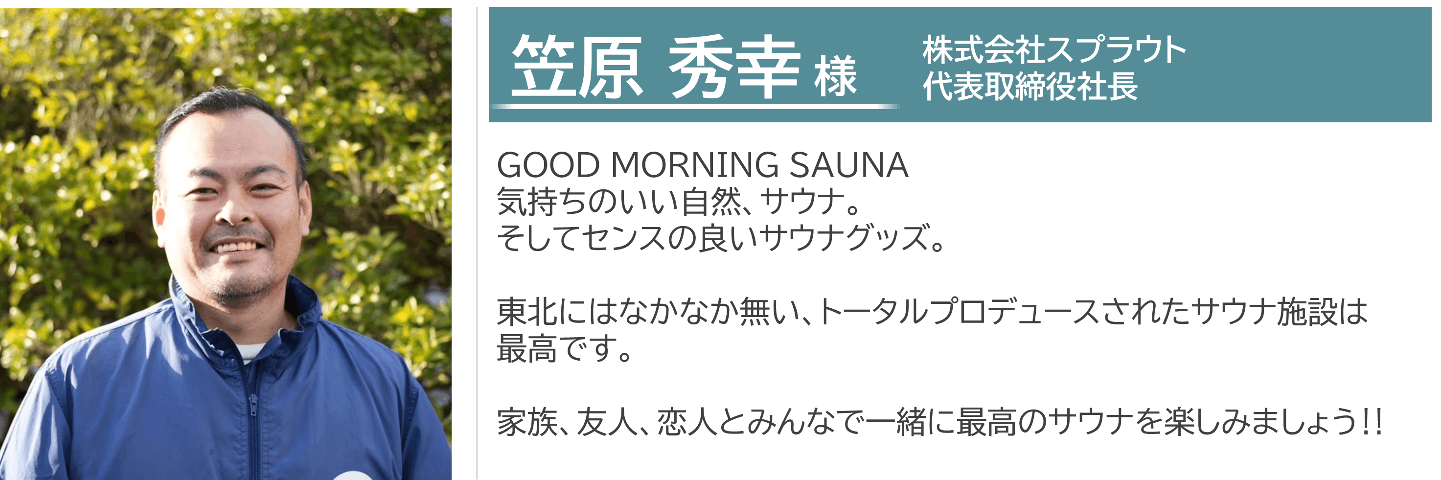 「東北は冬になると遊びが限られる」というお声がよく聞かれますが、サウナは冬にこそ本領発揮します。今後は青根を拠点に、エアストリームサウナやツリーハウスサウナなど拡大し、サウナを通して色んな方々と繋がり、たくさんのコラボレーションを行っていきながら、皆さんと一緒に地元宮城を盛り上げていきたいと思います。