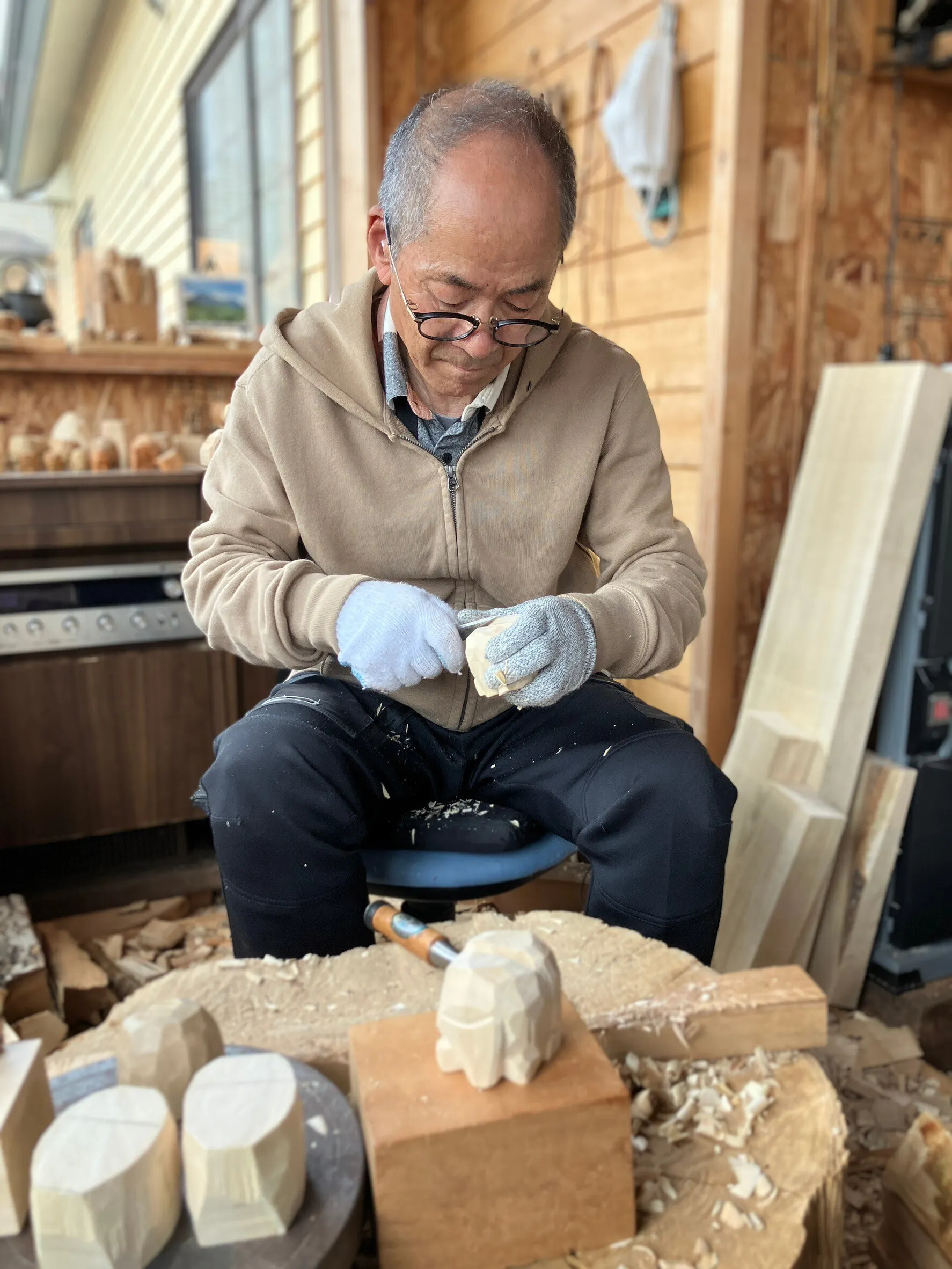 私は八雲町の熊友工房の小熊秀雄さんのもとで、木彫り熊制作体験をしていた時、小熊さんから、「能登のために木彫り熊で何かできることはないか。震災で倒れた家の木から熊を彫って復興支援できないか。」という提案をいただきました。小熊さんは八雲町にて100年つづく木彫り熊の伝統的な技法である「はつり彫」を唯一継承している方です。