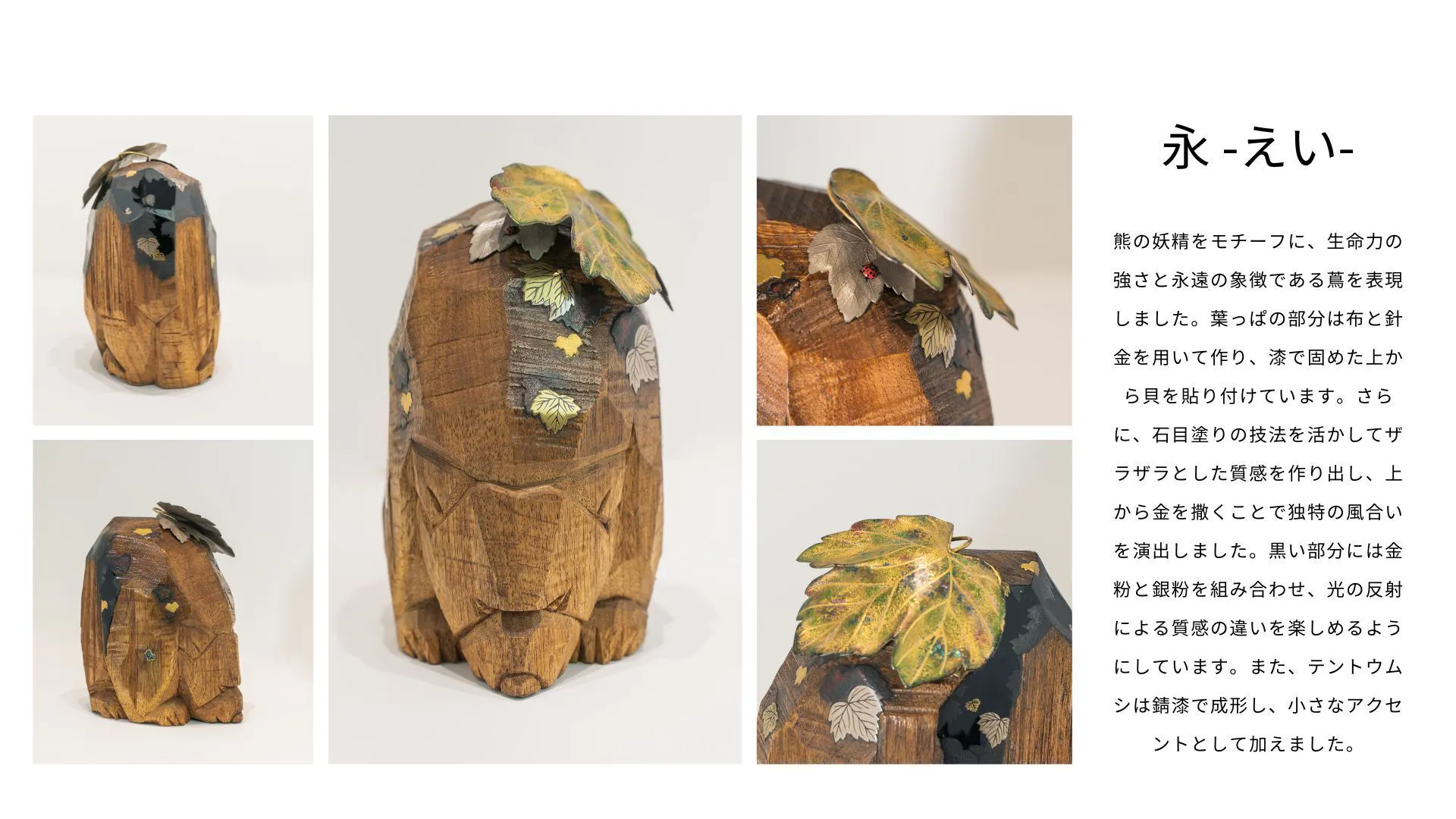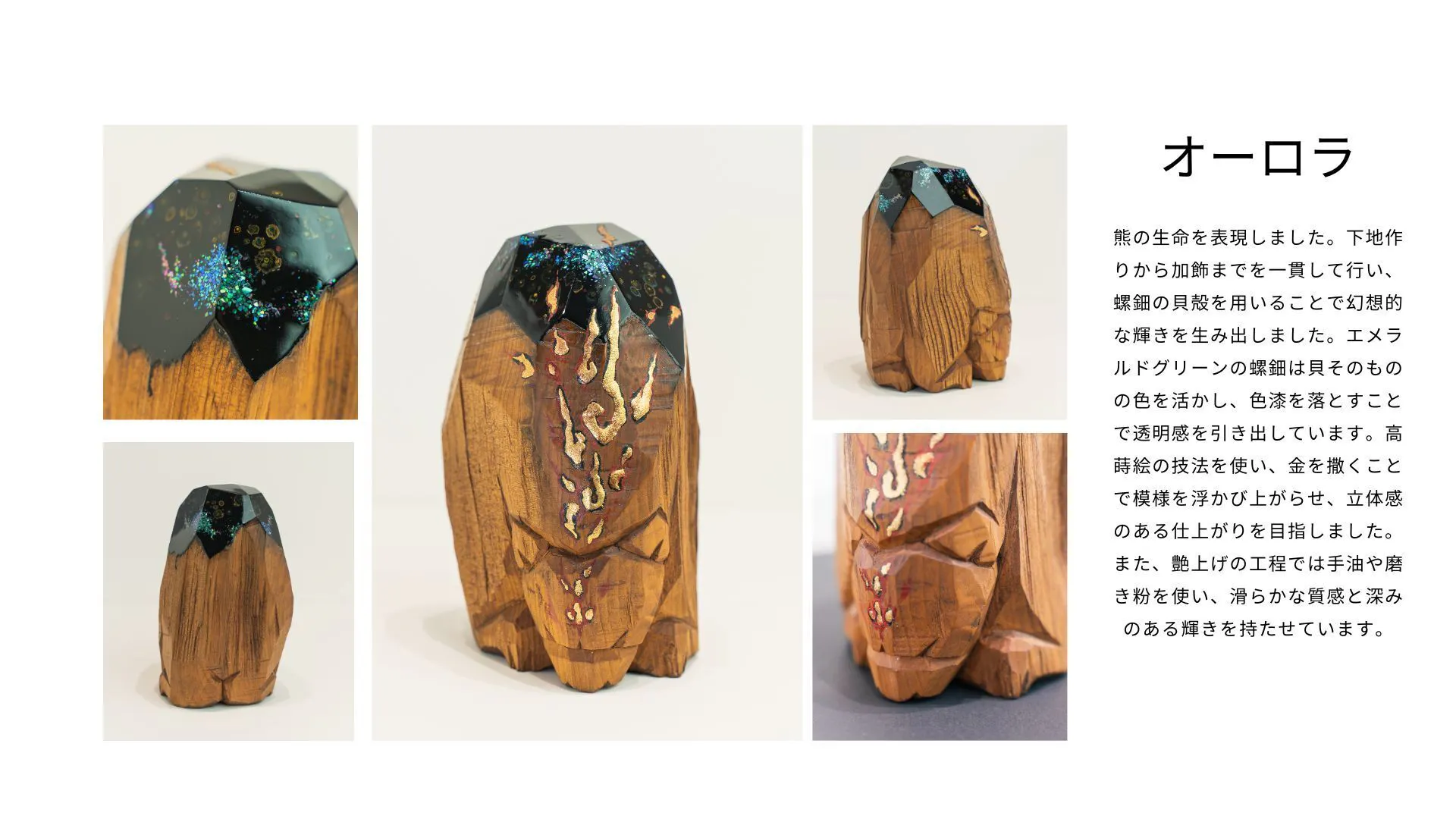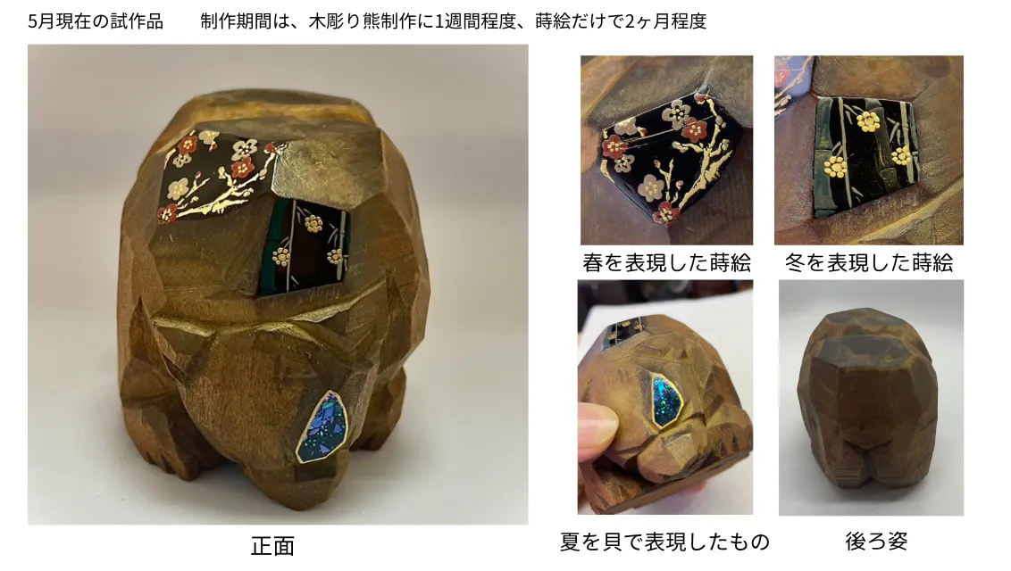 そんな時震災後に下沢さんから、北海道の木彫りのクマに漆で装飾して作品を作らないかと連絡をいただきました。震災以降沈みがちだった気持ちが制作するにつれて元気になって前向きになれました。このコラボは自分自身にとっても新しい挑戦、成長につながっていくと確信しています。制作はとても、大変苦しい部分もありますが楽しんでワクワクしながら制作しています、どうぞ楽しみにお待ち下さい!」