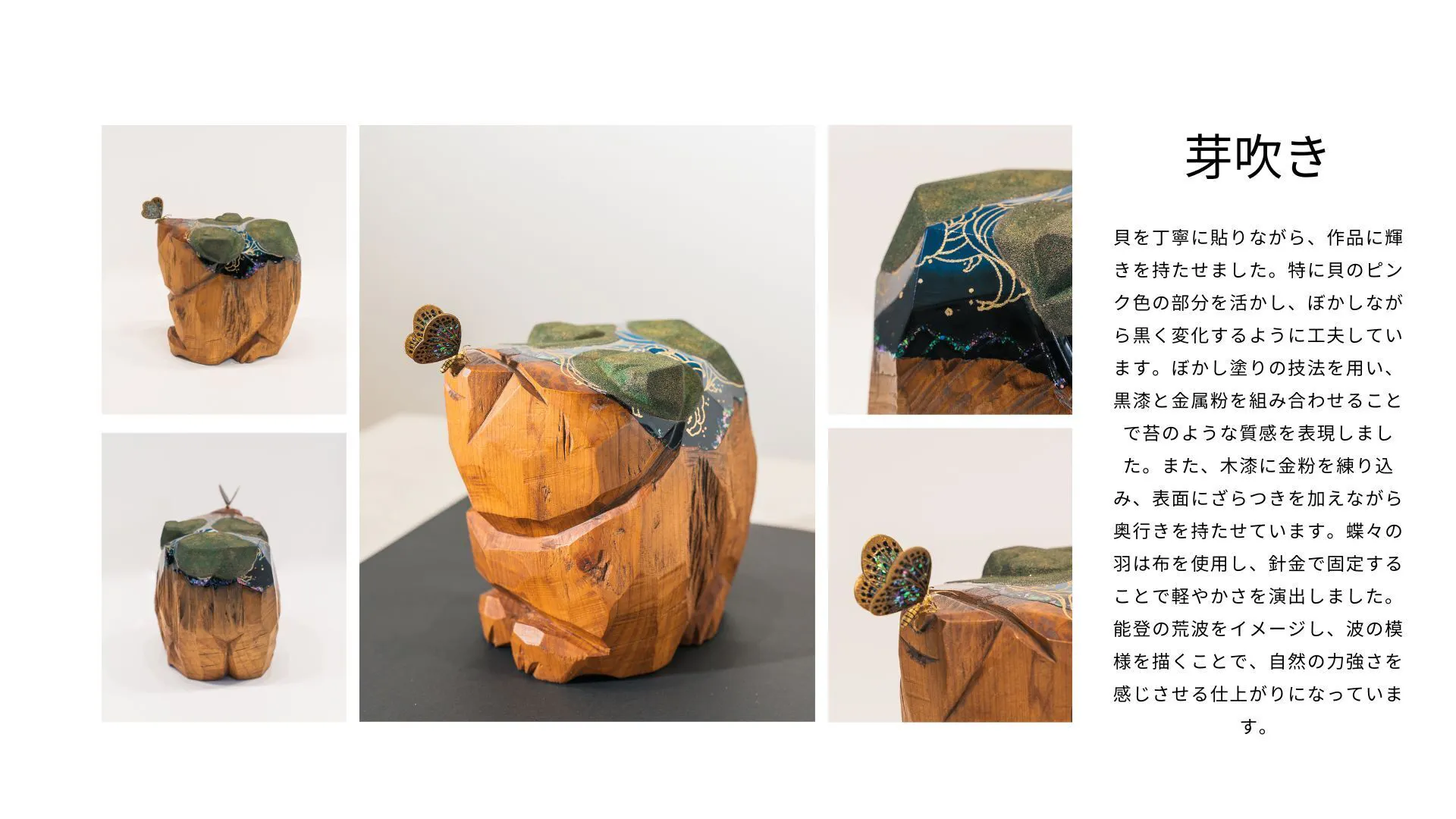 2025/03/17 23:56本日は木彫り熊三体のうち一作品の「芽吹き」をご紹介させてください!「芽吹き」漆芸の伝統技法を駆使し、生命の芽吹きを表現した一体。下地から丁寧に施し、螺鈿(らでん)の技法を用いて貝をふんだんにあしらいました。キラキラと光る貝の輝きの中でも特にピンク色の部分を選び青色に変化していく様、背中の中央から徐々に青から黒へとぼかしていくグラデーションを施しています。これは「ぼかし塗り」と呼ばれる技法を用いたものです。また、黒蝋色(ろいろ)の漆と金属粉(すず粉)を蒔き、緑色の乾漆粉を用いることにらより苔のような質感を演出。さらに、金粉を指で練り込むことで、苔の黄色い部分を表現しました。表面は滑らかな部分とざらついた部分が共存し、奥行きのある仕上がりとなっています。蝶々は軽やかさを重視し、金属ではなく麻布を使った乾漆技法で仕上げ銅線を用いて差し込み、足や触角はステンレスの釘を0.2ミリの細さまで削り漆を焼き付けて漆を定着させています。羽は青と金のコントラストが鮮やかに映え、装飾の華やかさを際立たせ繊細に仕上げています。羽の黒い斑点は螺鈿ではなく漆で描かれたものであり、熊の背中の波模様は能登の荒波をイメージしました。 もっと見る
