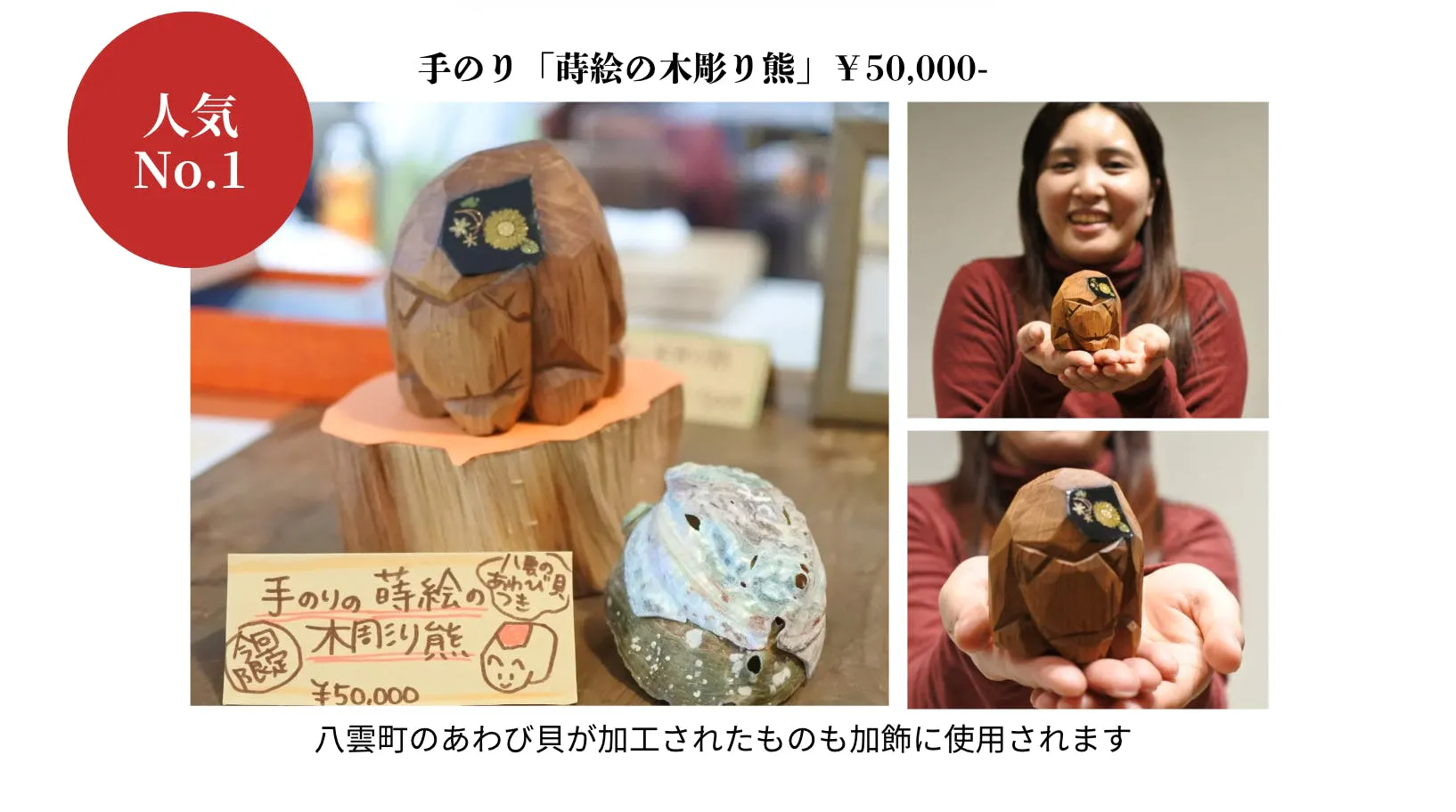 今回のリターンでは様々なものを用意しました。さらにこのリターン自体が大森さんの制作を支えるものになるように設計しました。1番今回オリジナルで用意している一押しのものは、こちらの手乗りバージョンのわじま熊さんです!木彫り熊の面一面だけ蒔絵が施されており、今回オリジナルとなっております。さらにこの上に、八雲町の特産品である鮑貝が加工されたものも加飾され素敵なものとして発送されます。ぜひ家に一熊さん、いかがでしょうか?