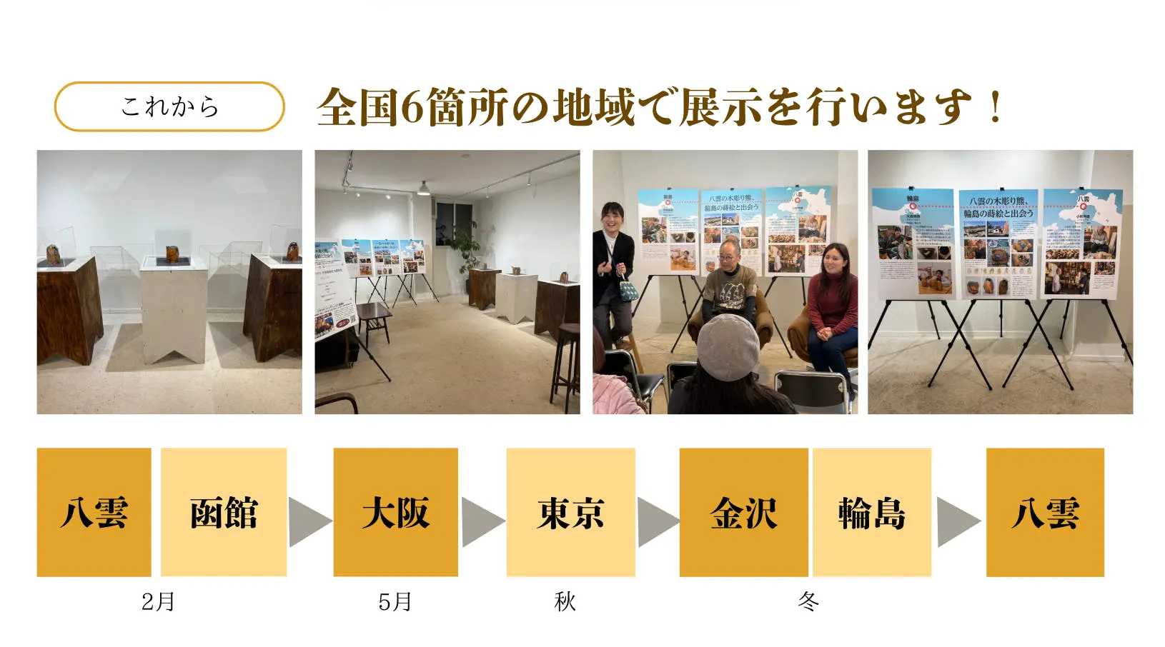 このプロジェクトでは、大森さんをはじめ、輪島塗の本当の復興を目指し、輪島塗と今まで出会うことのなかった木彫り熊をコラボさせることで、新しい価値を創出し、全国4箇所で展示会を行い全国に発信します。