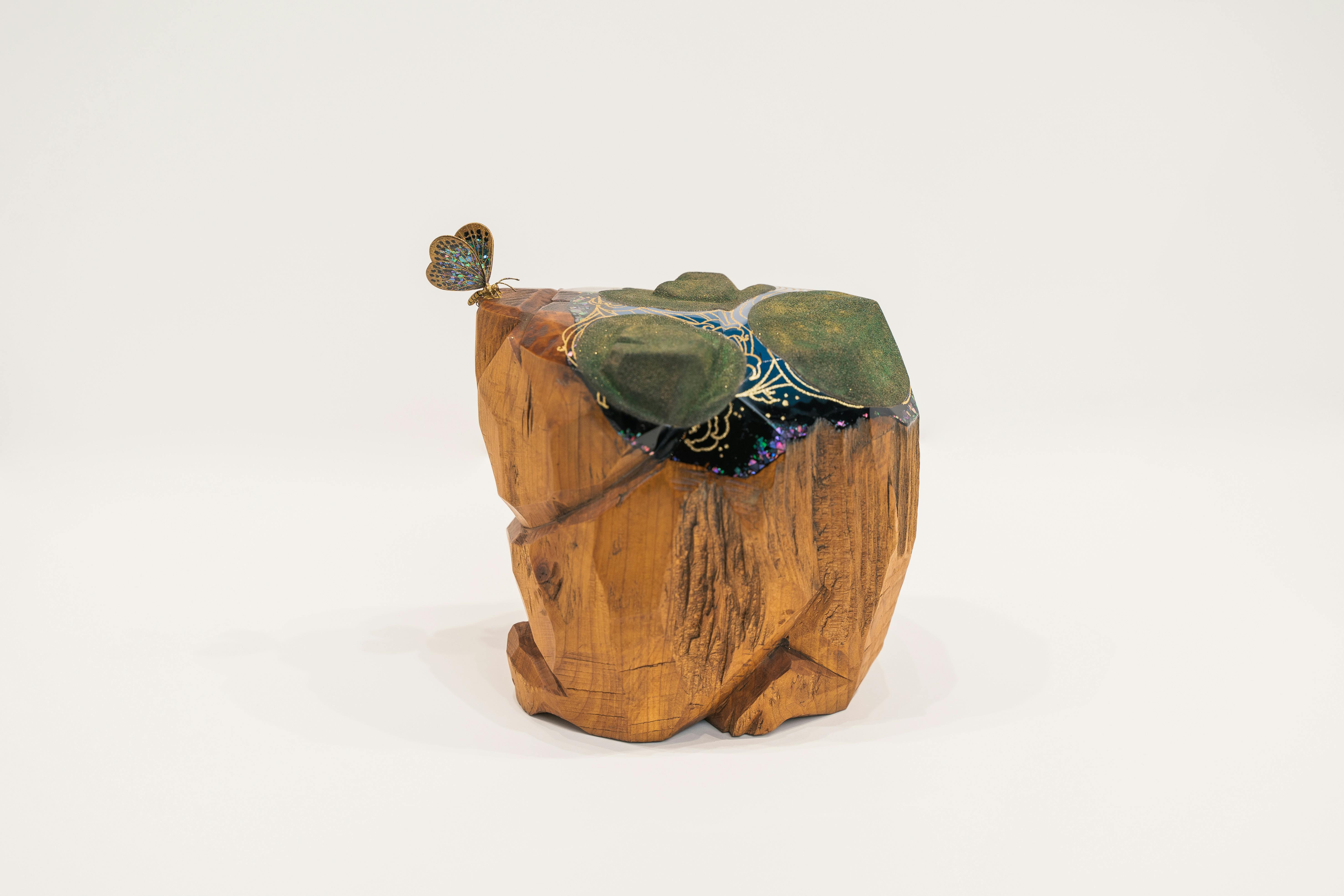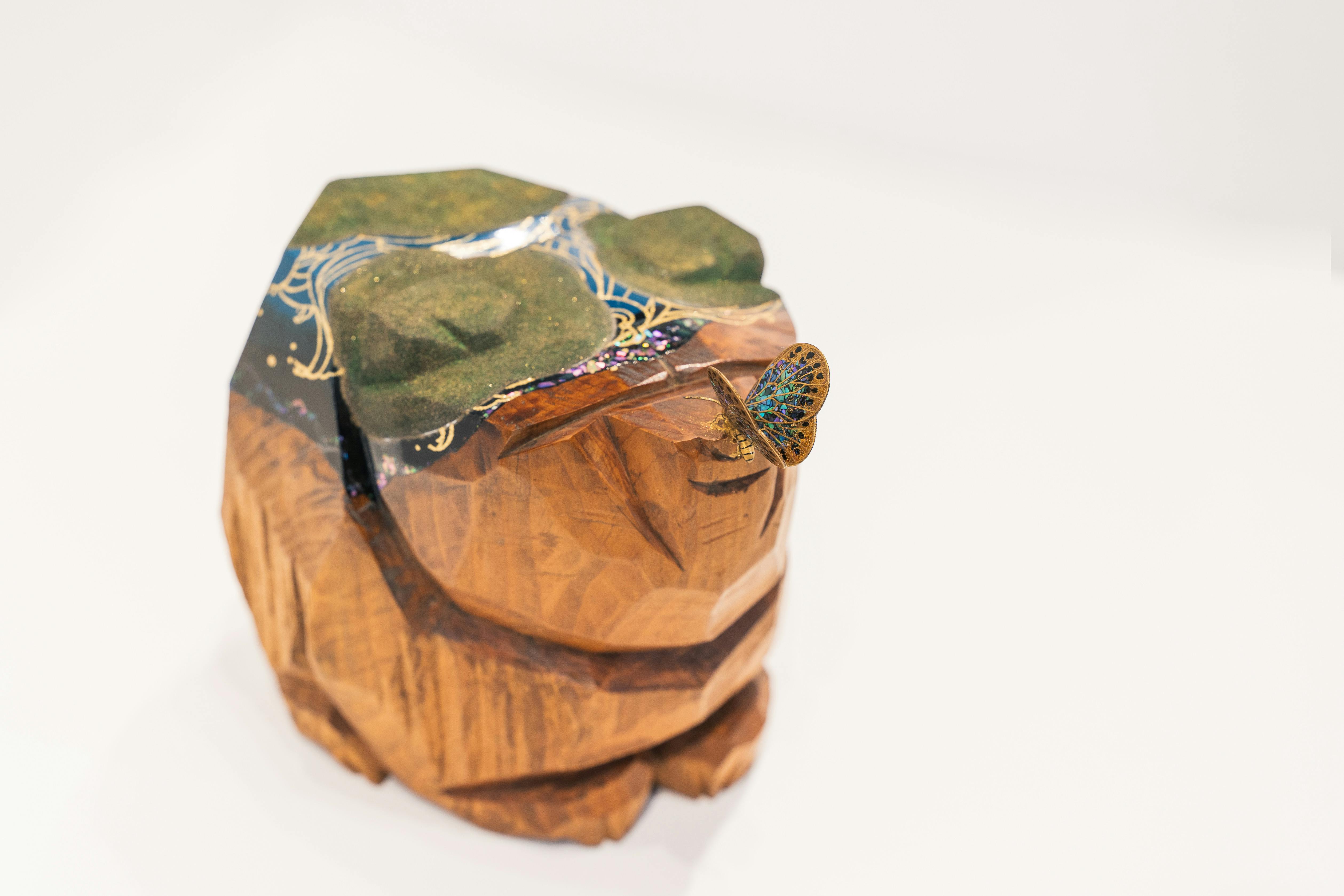 また、黒蝋色(ろいろ)の漆と金属粉(すず粉)を蒔き、緑色の乾漆粉を用いることにらより苔のような質感を演出。さらに、金粉を指で練り込むことで、苔の黄色い部分を表現しました。表面は滑らかな部分とざらついた部分が共存し、奥行きのある仕上がりとなっています。
