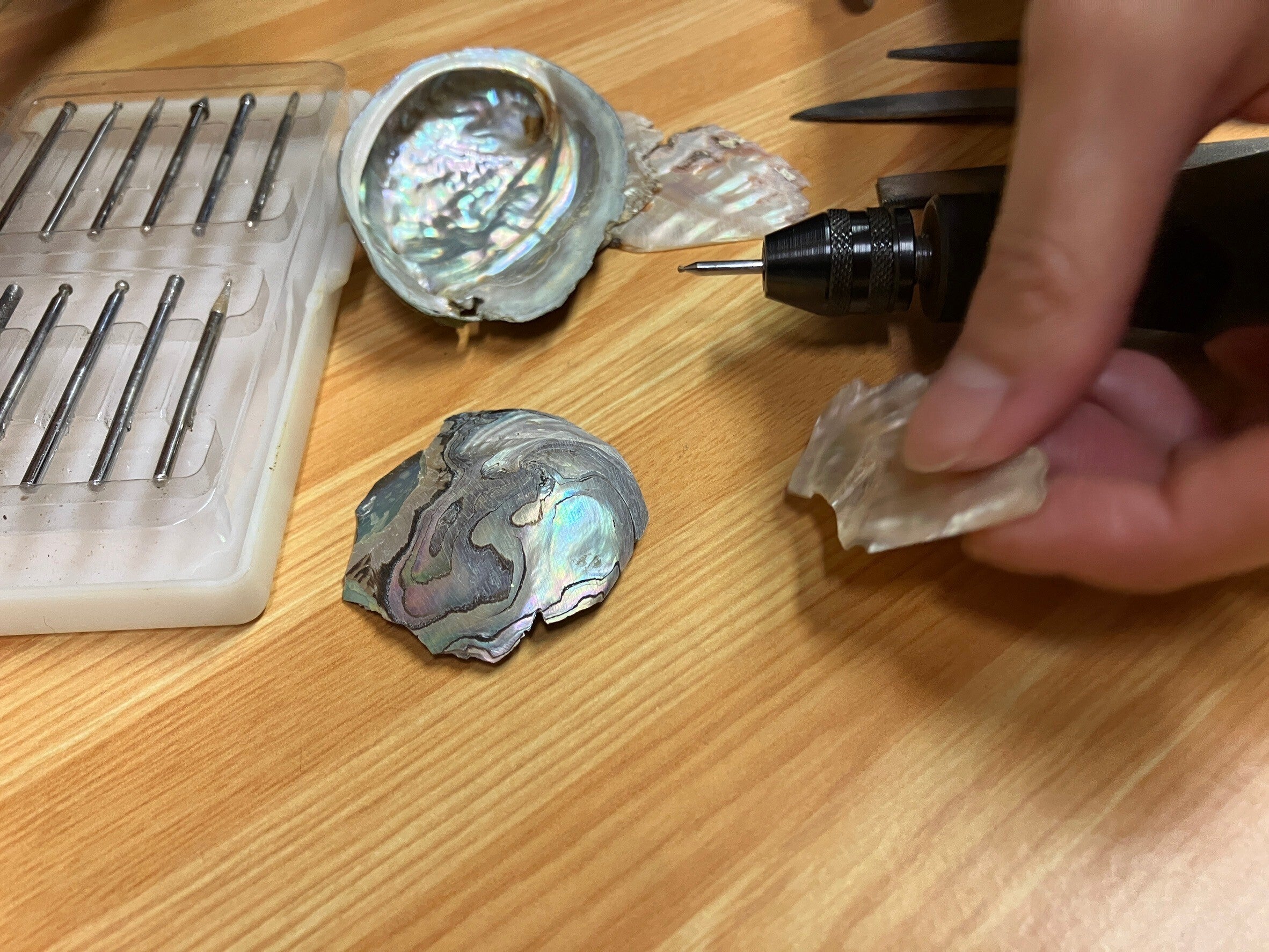 こんにちは。応援いつもありがとうございます!!下沢杏奈です!先日クラウドファンディングの返礼品のわじまくまさんの螺鈿(貝を加工した飾り)作成のための下準備、制作を行ってきました。今回使う貝は、なんと八雲町のアワビ貝。この貝を、ヤスリで削って削って、とても薄い貝に加工。さらに、貝を丸の形にグラインダーを使って加工します。とてつもなく細かい作業。手作業で作成できたのは2時間で10個もいきませんでした。。。職人さんはすごいなと敬意を払いつつ、できそうなところは、函館に戻って私の宿題にしました。頑張ります!今度も応援よろしくお願いいたします。