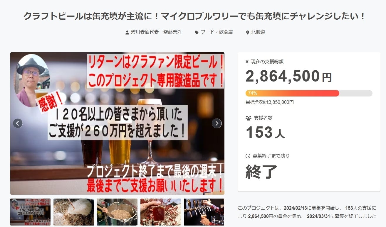 2025/04/17 08:16齋藤です。先週お知らせした通り、限定ビールにてご支援いただいた方へのリターン発送を順次実施いたしまして、昨日、最後の荷物を佐川急便が集荷していきました。最近、荷物が多いのか、少しお届けに日数を要することがあるようですが、あと数日で、皆さまにビールが届くと思います(すでに到着された方からのご連絡などもいただいております。ありがとうございます)。万一、違うものが届いた、届いたが破損していた、もう1週間経つのにまだ届かない、などありましたら、ご連絡ください。対応させていただきます。あと、「齋藤と飲む権利」にてご支援いただいた方で、まだ日程調整に関するご連絡をいただいていない方、いつでもご連絡ください。お待ちしております(権利行使期限は本年11月末日までとなっております)。 ~~~この度は、缶の調達に関するプロジェクトにご支援いただきましたこと、あらためてお礼申し上げます。また皆さまからのご支援を頂きたい案件ができましたら、ご相談をさせてください。今後ともどうぞよろしくお願いいたします。幸せを感じるビールを食卓へ 澄川麦酒 齋藤泰洋 もっと見る