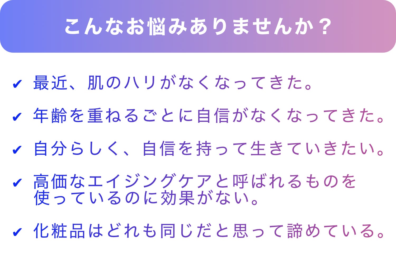 私たちの商品を使わなければ、お客様が損をする。何も効果のない商品を買わされてしまう!というマインドセットで絶対的な自信を持っています。原材料をふんだんに配合し、優れたものを製造すること。私たちは、エイジングケア化粧品を通じて、女性の美と自信を支え、未来への希望を届けたいと考えています。