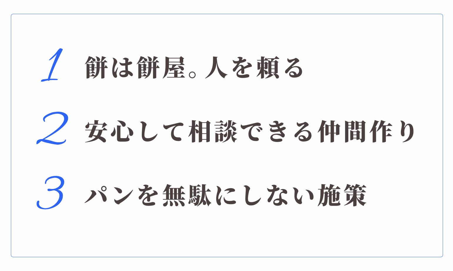 余ったパンは家族が食べる、だけではなく、購入以外にも生かせる方法はないか?をその人の販売状況や環境に寄り添ってアドバイスいたします。