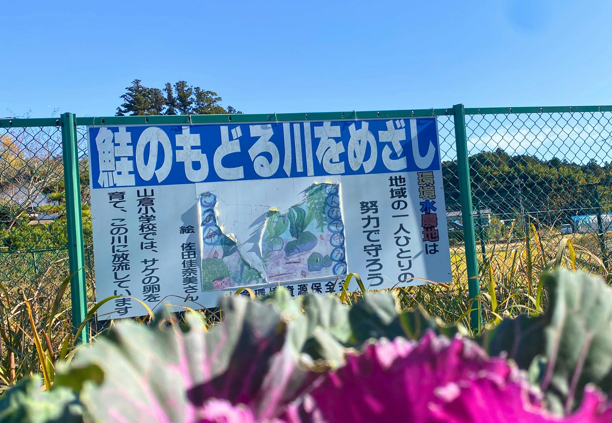 車を停め、観福寺に向かって歩き出すと目の前にこの<鮭のもどる川をめざし>の看板を発見。