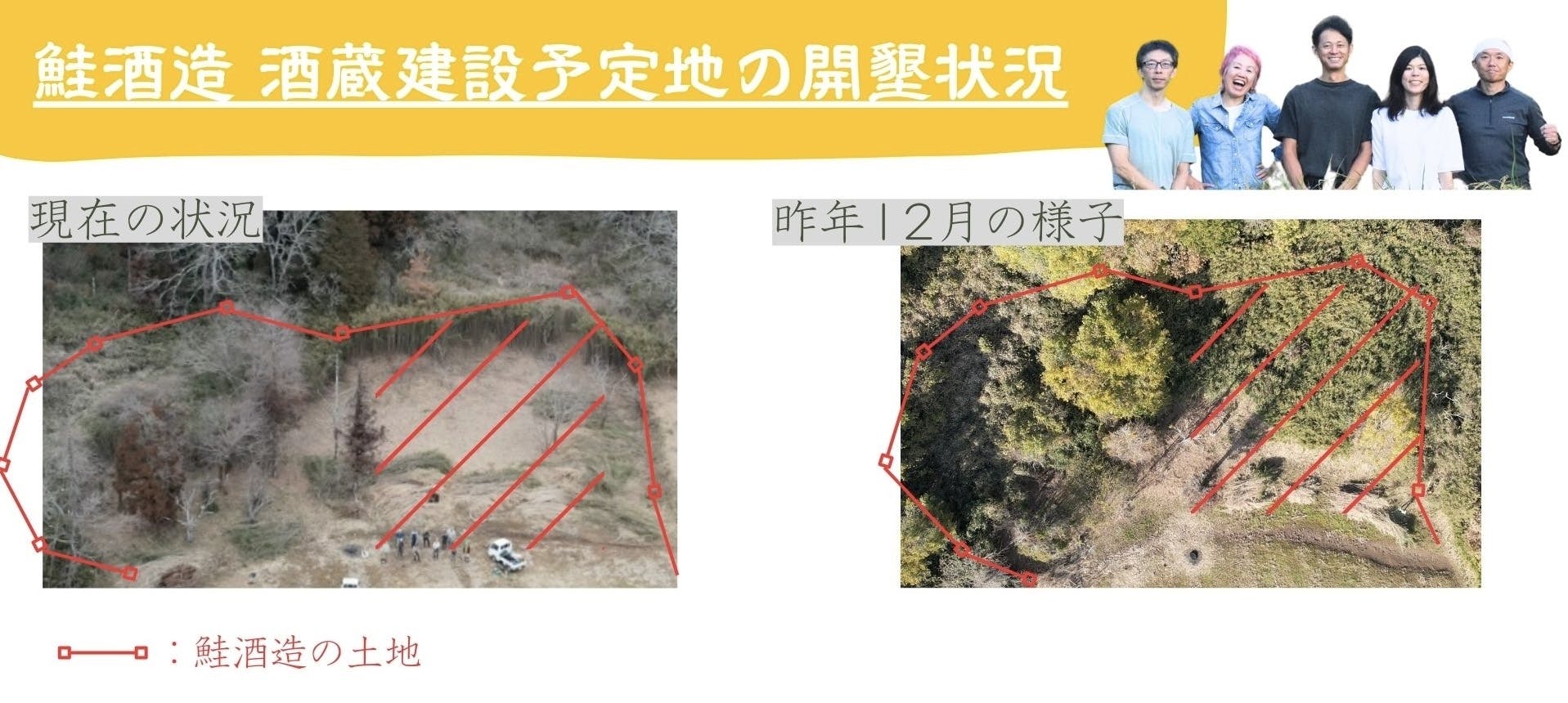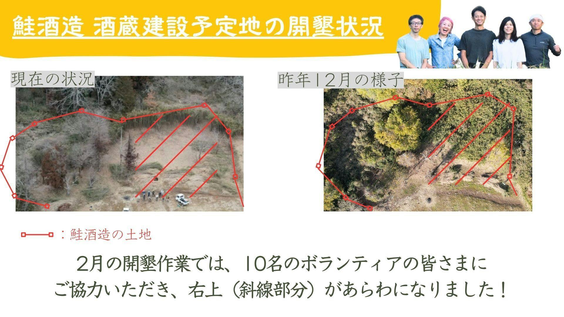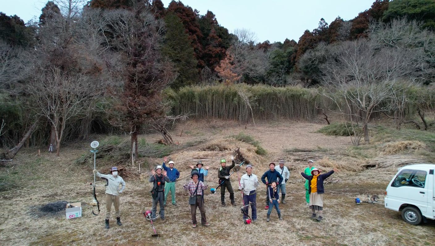 酒蔵の建設予定地の開墾状況のご報告です。2月の開墾では、初のボランティア募集にもかかわらず、10名の方々にご参加をいただきました。近隣住民の方から、茨城、東京からお越しの方もいらっしゃいました。本当にありがとうございました。ドローンで集合写真