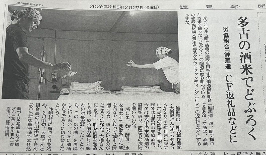 ”米どころ多古町で酒蔵の建設を目指す労働者協同組合「鮭酒造」が、町で採れた酒米を使った「どぶろく」の醸造に取り組んでいる。できあがった酒は、酒蔵の建設機材購入費用を募るクラウドファンディング(CF)の返礼品などにする予定だ。”