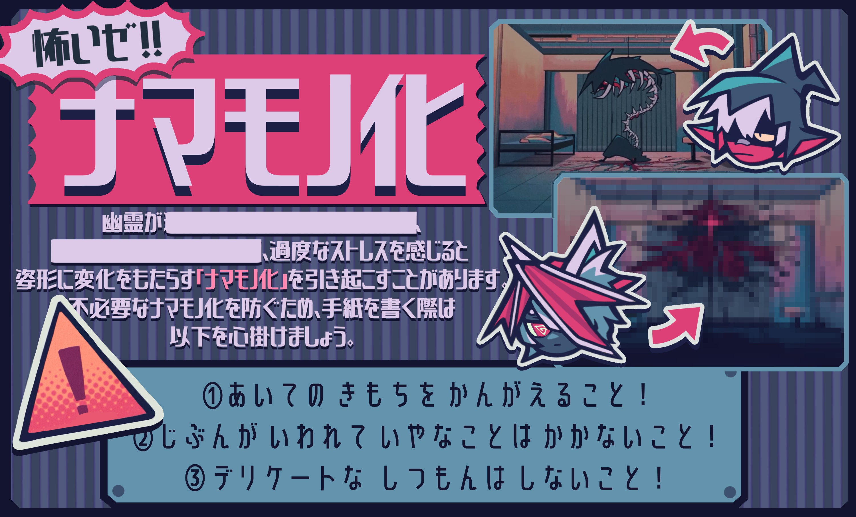 ナマモノ化した幽霊は食餌を求めて牢から出ようとして暴れたり、間接的·直接的に他の牢にいる幽霊に危害を加える可能性がございます。望ましい状態ではございません故、手紙を書いて送る際は可能な限り以下内容を遵守して頂くようお願い致します。