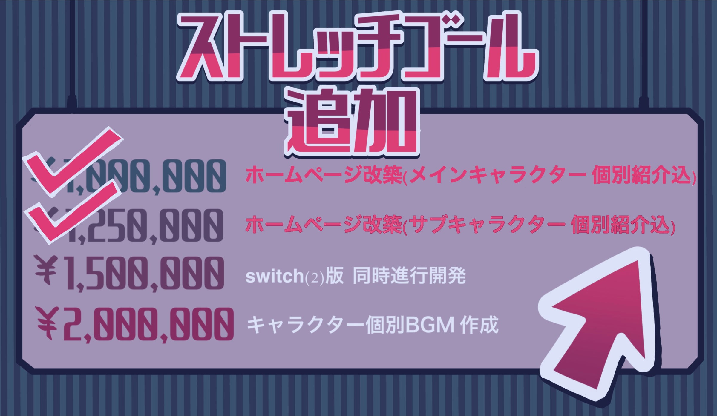 ¥1,500,000 突破にて switch(2)向けの開発を同時進行で行っていきます。(リリース時期を考えると、switch2でのリリースとなるかと思われます。)