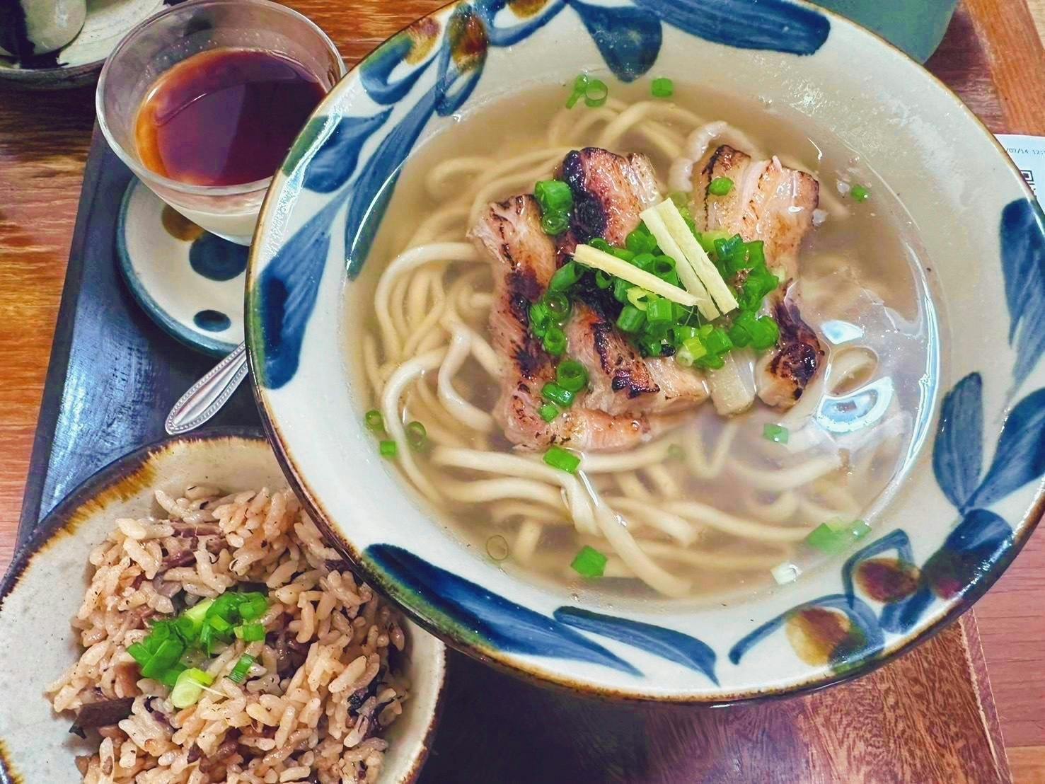 ↑ ボクが日本一美味しいと思っている『今帰仁そば』の炙り塩味三枚肉そば、じゅーしー(炊き込みご飯)、自家製黒糖プリンのセット。