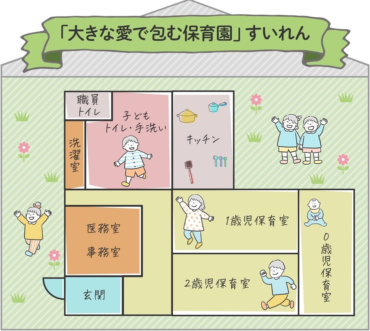 すいれんの園内は0才児、1才児、2才児のエリアに分かれつつも、壁ではなくパーテーションで区切る形で園内のどこにいても子供が見渡せる施設になります。