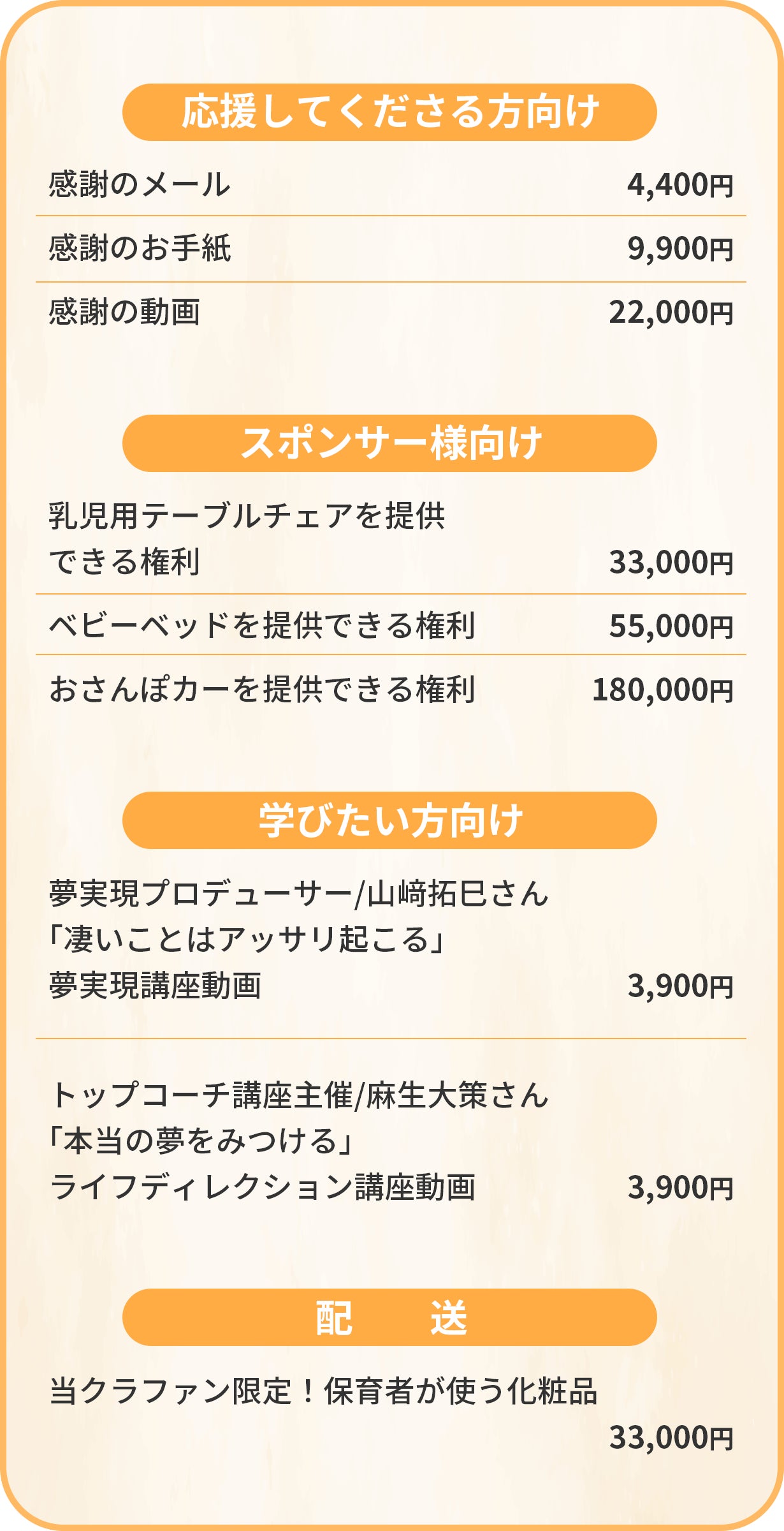 *配送を伴うリターンに関しては支援金額に配送料も含まれております