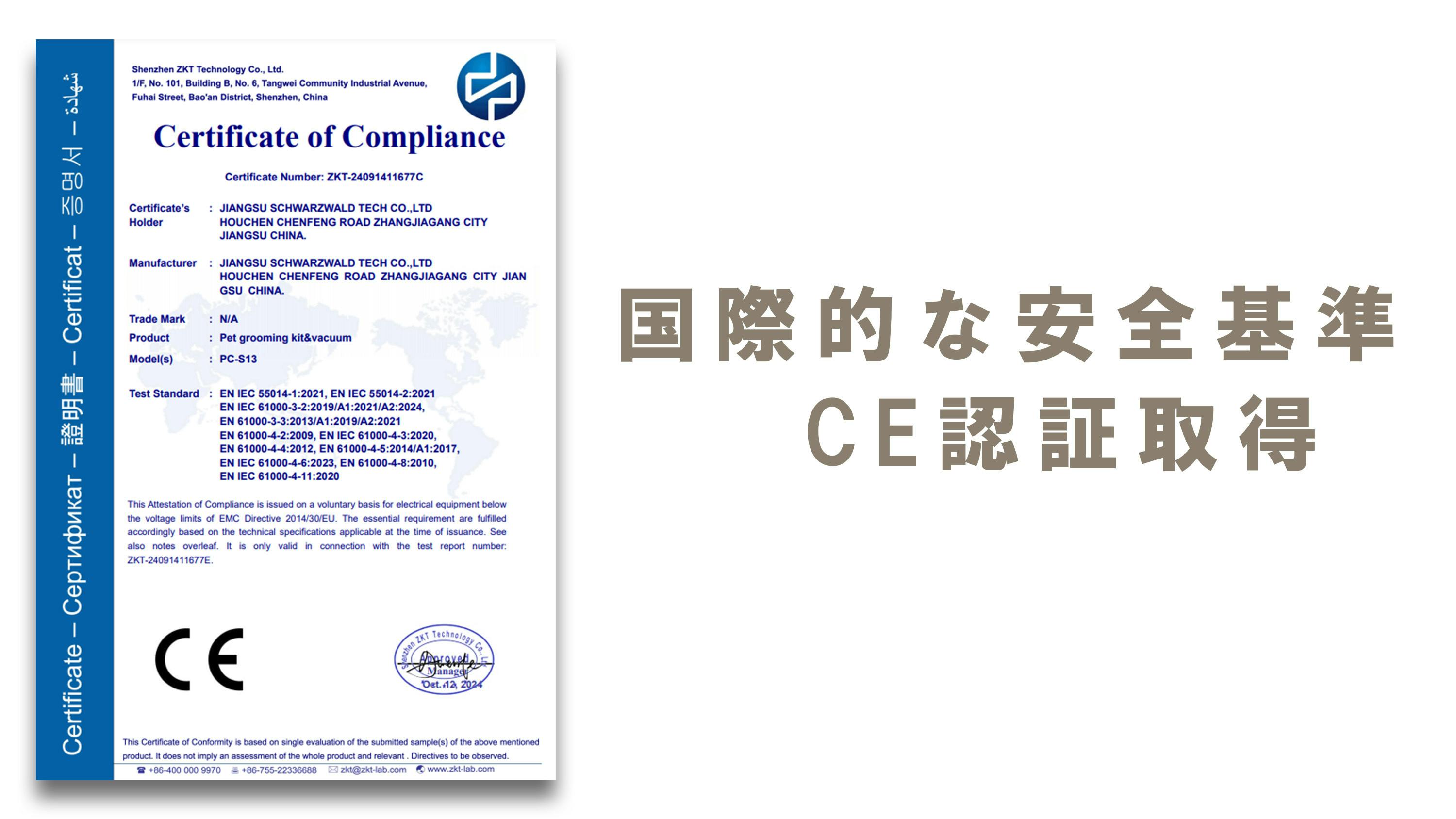 愛犬愛猫のために、安心してお使いいただきたいから。国際的な安全基準であるCE認証を取得しております。