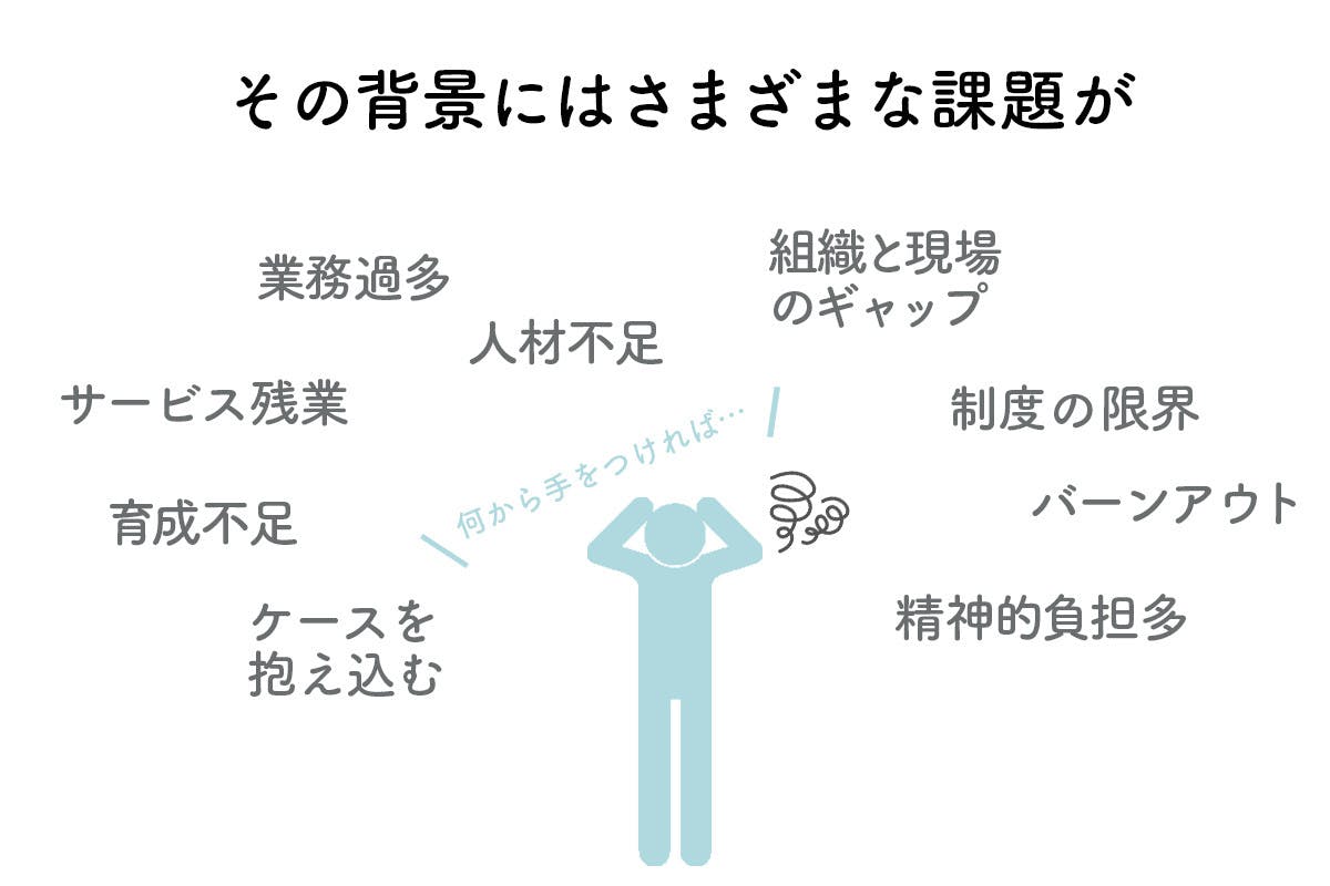 その背景には個人、組織、社会のさまざまな問題が複雑に絡み合い、構造的な課題となっているため支援者ひとりの力でこの状況を抜け出すのはとても大変です。結果、ライフワークバランスを取ることも難しい状況の中で葛藤する。心身に不調が出ているにもかかわらず、その状態を受け入れられないケースもある。