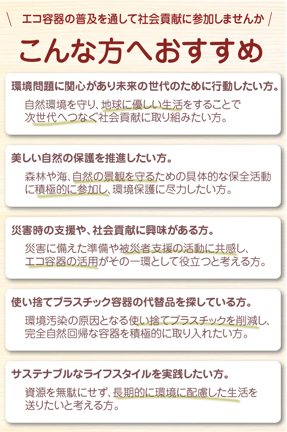 私の目標は、エコ容器を通じて子どもたちの未来を守ることです。