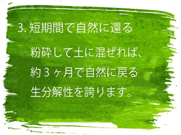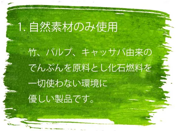 従来の『エコ容器』や『紙コップ』『紙皿』は、耐水性や耐油性を高めるためにプラスチックで表面をコーティングすることが一般的です。しかし、『完全エコ容器』はこの課題を克服し、完全に脱プラスチックを実現しています。自然素材のみで製造されているため、化石燃料を一切使用せず、温室効果ガスの削減に貢献します。竹は成長が早く再生力が強いため、持続可能な資源として優れており、キャッサバは食品廃棄物の削減に役立ち、廃棄後は土壌に還る特性を持っています。これらの素材を選ぶことで、自然環境を守り、持続可能な未来との調和を実現する大切な一歩となっています。