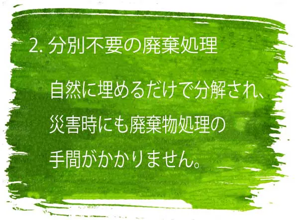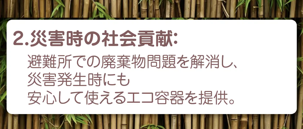 次に、災害時の社会貢献に関する取り組みです。日本は地震や台風などの自然災害が頻発する国であり、災害時の避難所では廃棄物処理の問題が深刻です。この問題を解決するために、「完全エコ容器」は避難所で安心して使用できるよう設計されています。分別が不要で自然に分解される容器は、避難所での衛生管理を容易にし、ストレスを軽減します。また、災害時でも環境負荷を低減することで、被災者支援と自然保護の両立を目指しています。