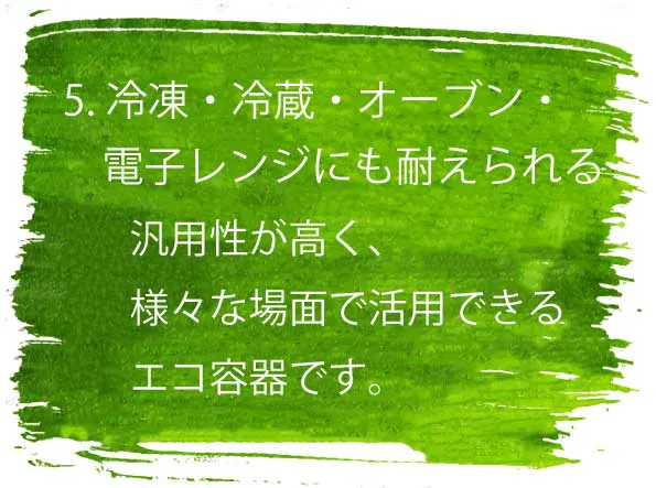 さらに、家庭での使用を想定し、電子レンジやオーブンでの加熱も可能という優れた耐熱性を備えているため、日常の調理や食品保存にも柔軟に対応します。 加えて、冷凍保存も可能なことから、食品の長期保存にも適しており、使い捨て容器としての役割を超えた汎用性が非常に高く評価されています。