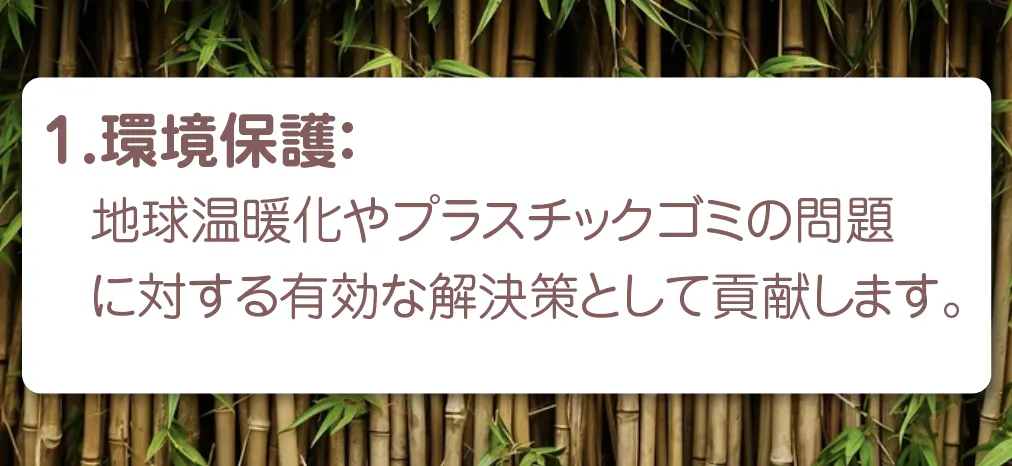 まず、環境保護についてです。現代社会において、地球温暖化やプラスチックゴミによる海洋汚染が深刻な問題となっています。これらの環境課題に対し、「完全エコ容器」は有効な解決策の一つとして貢献しています。竹やキャッサバ由来の自然素材を使用した容器は、生分解性が高く、土壌に還ることができるため、廃棄後も自然環境を汚染しません。たとえ川や海に流れても、完全に分解されて魚の餌になることができます。これにより、プラスチックの使用削減に大きく寄与し、自然と調和した社会の実現を目指しています。