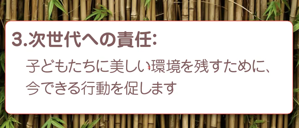 最後に、次世代への責任について考えてみましょう。私たちが今行う環境保護の行動は、未来を生きる子どもたちのために大切な一歩です。自然豊かな地球を次の世代に引き継ぐためには、持続可能な選択を積極的に行う必要があります。小さな一つひとつの行動が積み重なり、未来を変える大きな力になります。このプロジェクトは、環境意識を高め、子どもたちに美しい地球を残すために、今できる具体的な行動を促します。