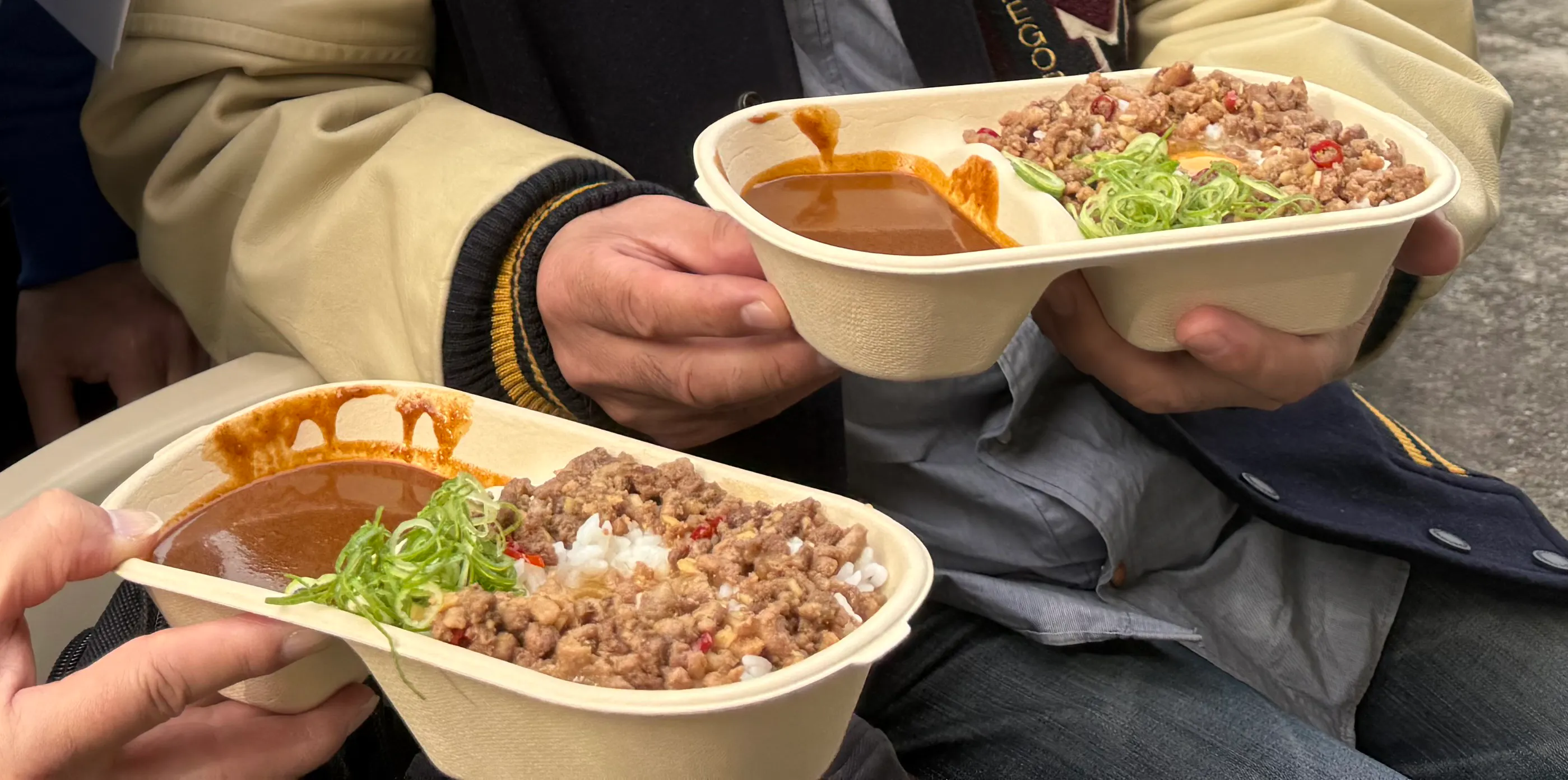 震災支援活動の一環として、現場に届けられた完全エコ容器。被災者の方々の食事環境を守るため、環境に優しい選択が災害地で役立っています。