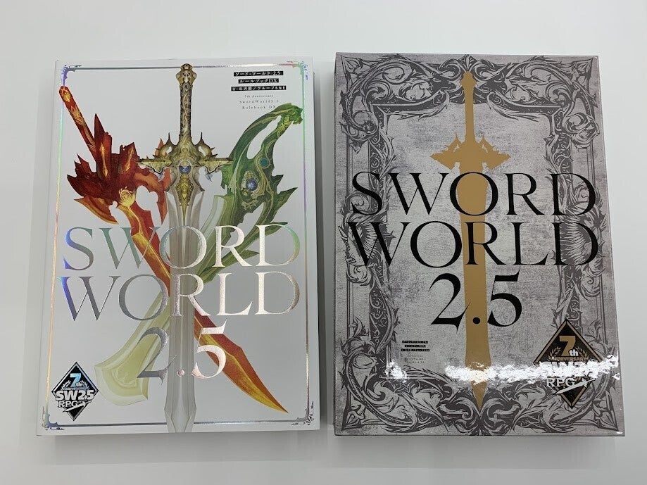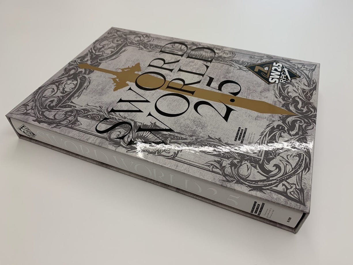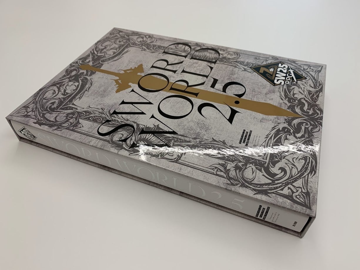 「限定版」のみに付属するボックスは、書籍がピッタリとフィットするサイズになっています。収納すると、以下のような形になります。こちらは、ルールブックをしっかりと護るような重厚なデザインとなっています。剣のシルエットは、ゴールドの特色仕様。それにクリアPPをかけていますので、汚れにくいようになっています。