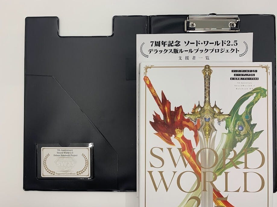 お次は、これもセットでリターンに追加されるダイストレーとポーチです。こちらは、今回の書籍にも掲載されている、専用の7周年記念ロゴをあしらいました。ポーチは、サイコロなどの小物だけではなく、ペンも入るサイズになっています。