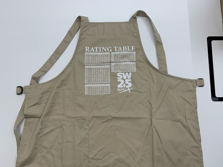 エプロンは、胸元に威力表が来るようなデザインとしています。当初はもっと大きく配置をする想定でしたが、エプロンを着用したまま座ると下の方が見えなくなる……といった問題があり、このようなデザインに。その分、下側のスペースにはポケットを配置して使い勝手を良くしております。