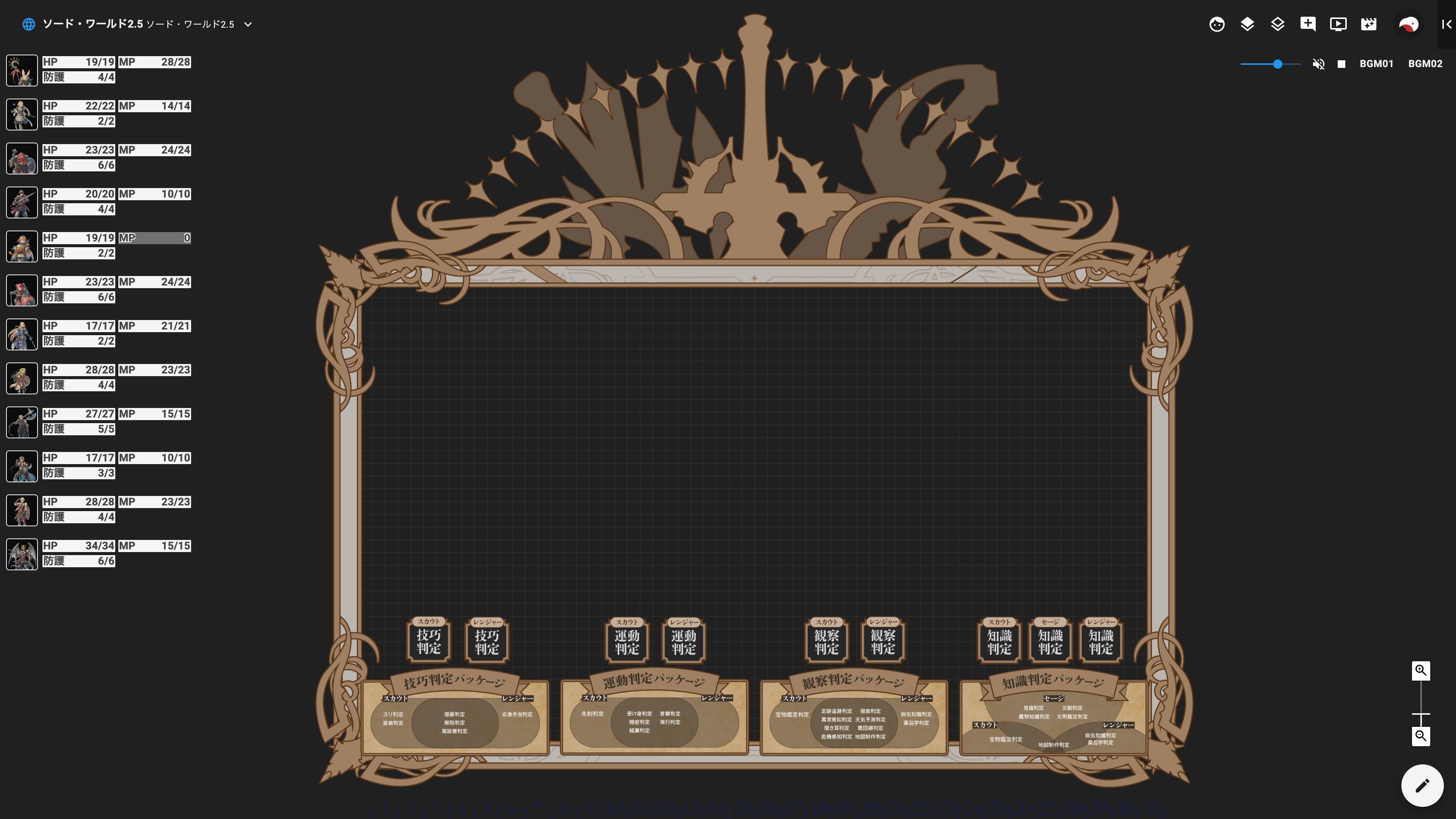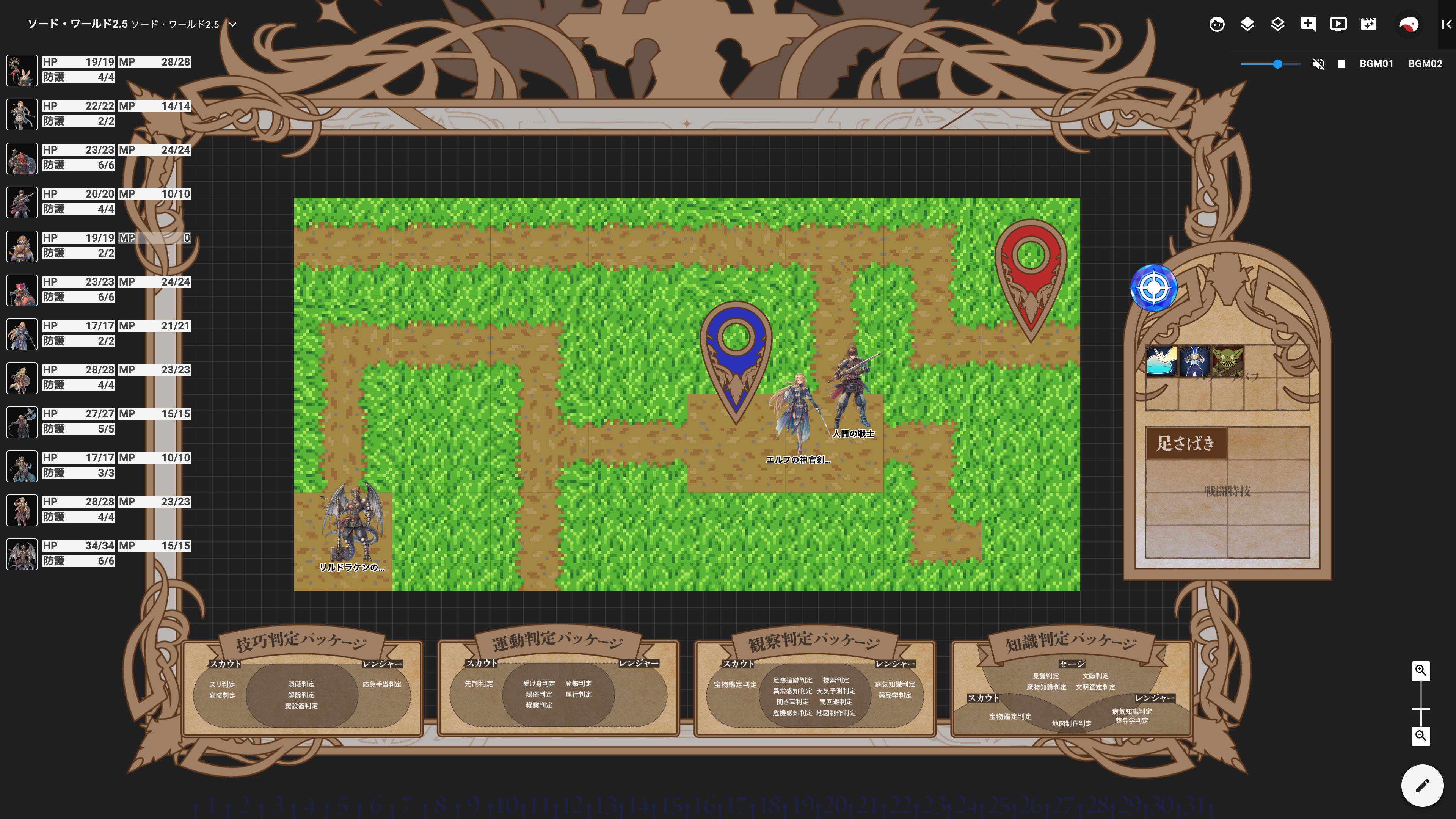 基本戦闘のマップもサポートしています。ここでも、頻出の判定ができるボタンを搭載しています。基本戦闘以外にも、上級戦闘などに汎用的に使えるデザインも収録する予定です。