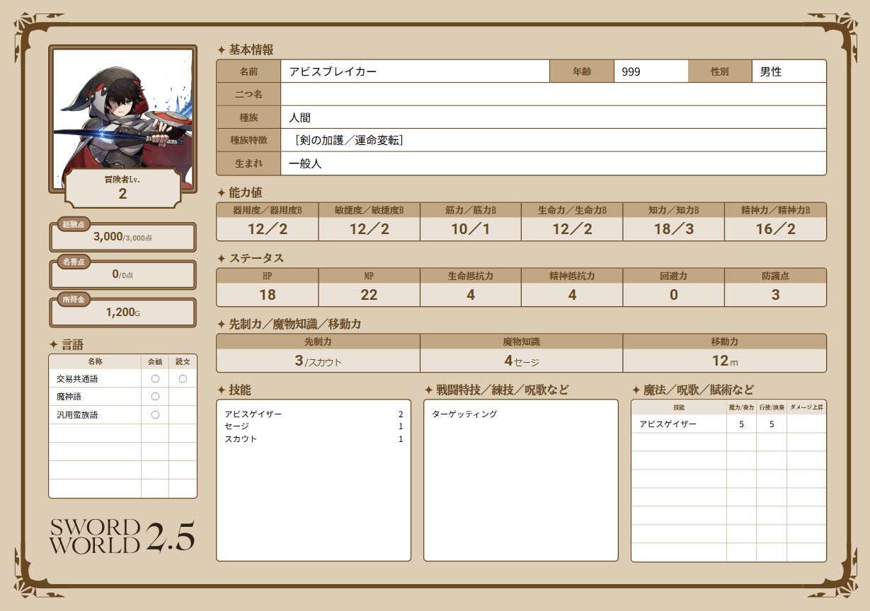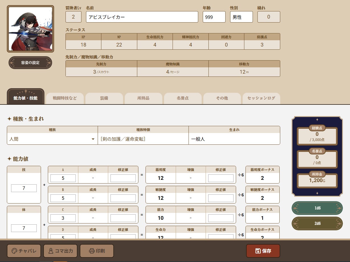 制作中のデータの入力画面になります。基本的には、現時点でKADOKAWAから発売しているサプリメントの技能や種族をサポートしています。