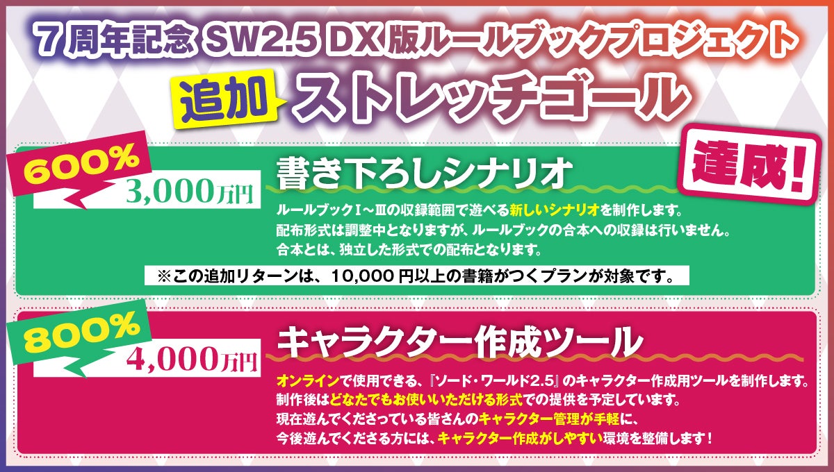 「7周年記念 ソード・ワールド2.5 デラックス版ルールブックプロジェクト」をご覧くださり、ありがとうございます。皆さまのご支援のお陰で、プロジェクトの支援総額は目標の5,000,000円を達成することができました! その上、さらに多くのご支援をいただいております。本当にありがとうございます。プロジェクトの公開から僅か1時間ほどの出来事であり、想像を遥かに超える反響に驚いております。これほどの多くの方に『ソード・ワールド2.5』を深く愛していただけていることを、何より嬉しく感じております。目標額は達成をいたしましたが、ご支援をしてくださった皆さんにさらに楽しんでいただける企画にするため、ストレッチゴールの検討を進めてまいります。もし新しいゴールに伴うリターンについてご要望やご提案などございましたら、メッセージやXなどでいただけると嬉しく思います。ストレッチゴールの設定ができましたら、また活動報告やXなどでご報告ができればと思います。一方で、想像を超えるご支援をいただいたこともあり、一部のプランが開始早々に「在庫なし」となってしまいました。支援ができなかったというお声も頂戴しており、大変申し訳なく感じております。これらのプランはクリエイターの皆さんと相談の上、限定数を設定しておりました。既に活動報告やXでもご案内しております通り、追加の余地がないか、検討を始めている段階です。必ず追加ができるかという点は現実点ではお約束ができませんが、ご希望してくれる方に少しでも多くお届けするため、努力をしたいと考えております。改めまして、たくさんの暖かいご支援をありがとうございます。引き続き、「7周年記念 ソード・ワールド2.5 デラックス版ルールブックプロジェクト」を何卒よろしくお願い申し上げます。