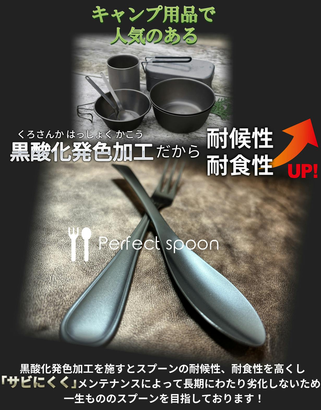 黒酸化発色加工という、キャンプの食器などに使われるカッコいい、ブラック色に仕上がっています。