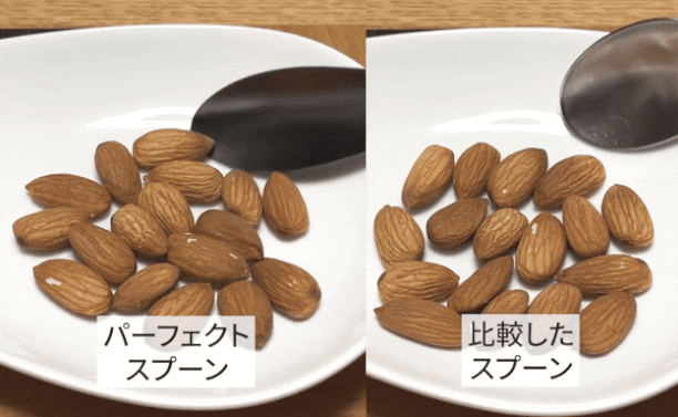 アーモンドをすくってみました。パーフェクトスプーンの方がアーモンドが拾われている様子がわかると思います。