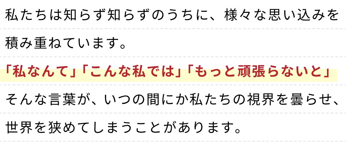 無意識に積み上げてきた思い込みや、ものの見方を変えるだけで、見える世界が大きく変わることをお伝えしたい。