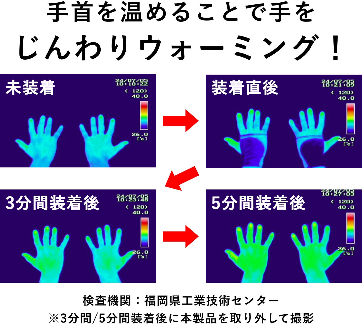 肌にピタッと密着するからごわつきがなく手を使う作業中にも装着が可能!体温由来の温かさを手首にしっかりと伝えてくれるアイテムです。