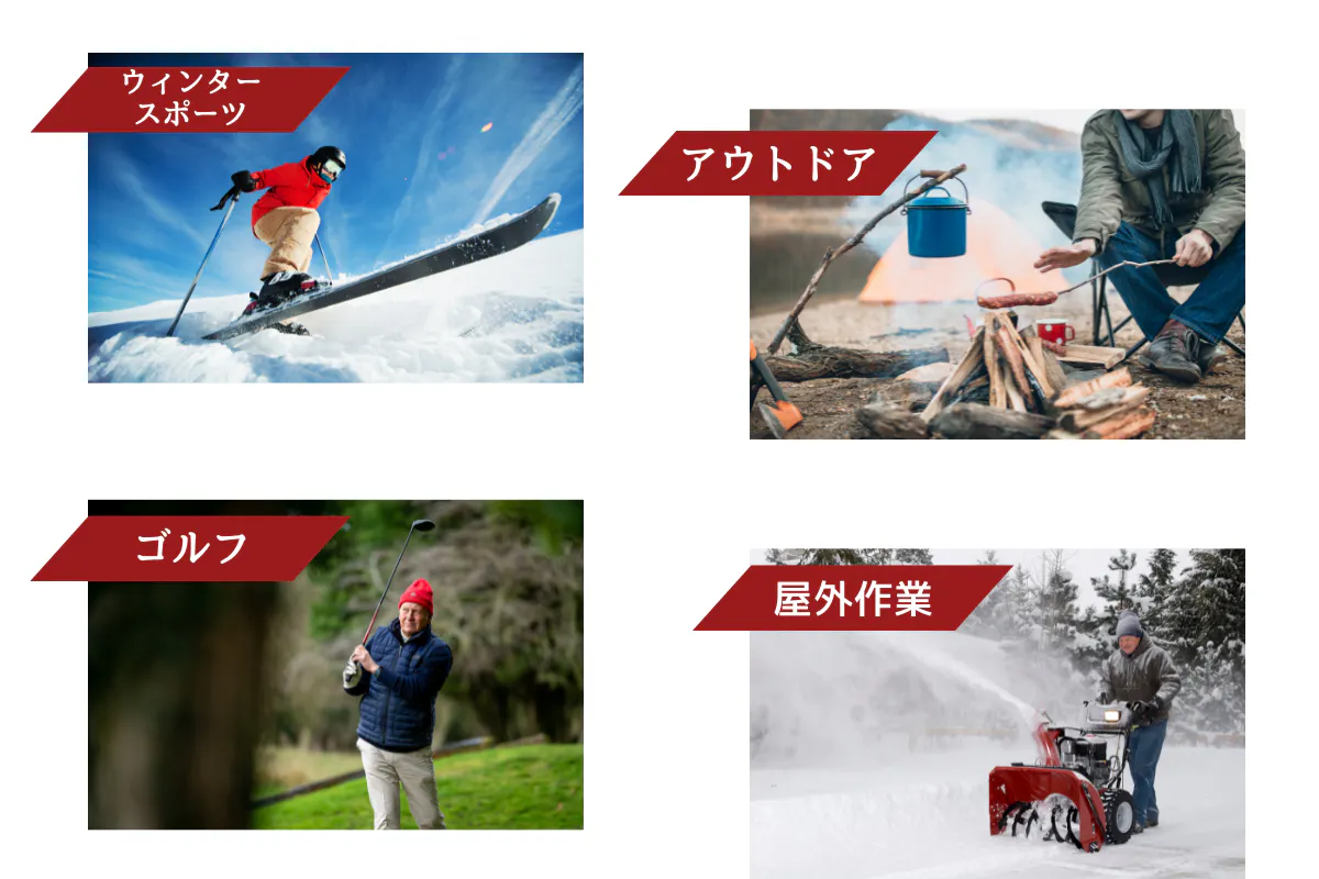冬のアウトドアはもちろん、建築作業+医療介護ほかあらゆる環境変化に対応しています。