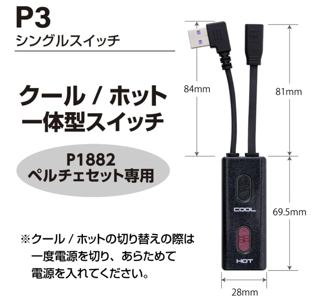 付属のスイッチひとつで冷暖切り替えと温度調整ができるので