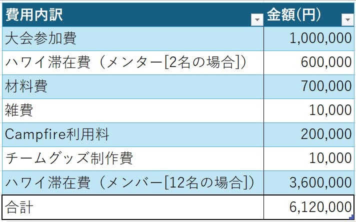 他の費用は一部企業スポンサー様に支援していただく予定ですが、現状では費用の大半をそれぞれのメンバーが負担することになります。そのため、クラウドファンディングでの目標金額は80万円としていますが、より多く支援していただけるととてもありがたいです。