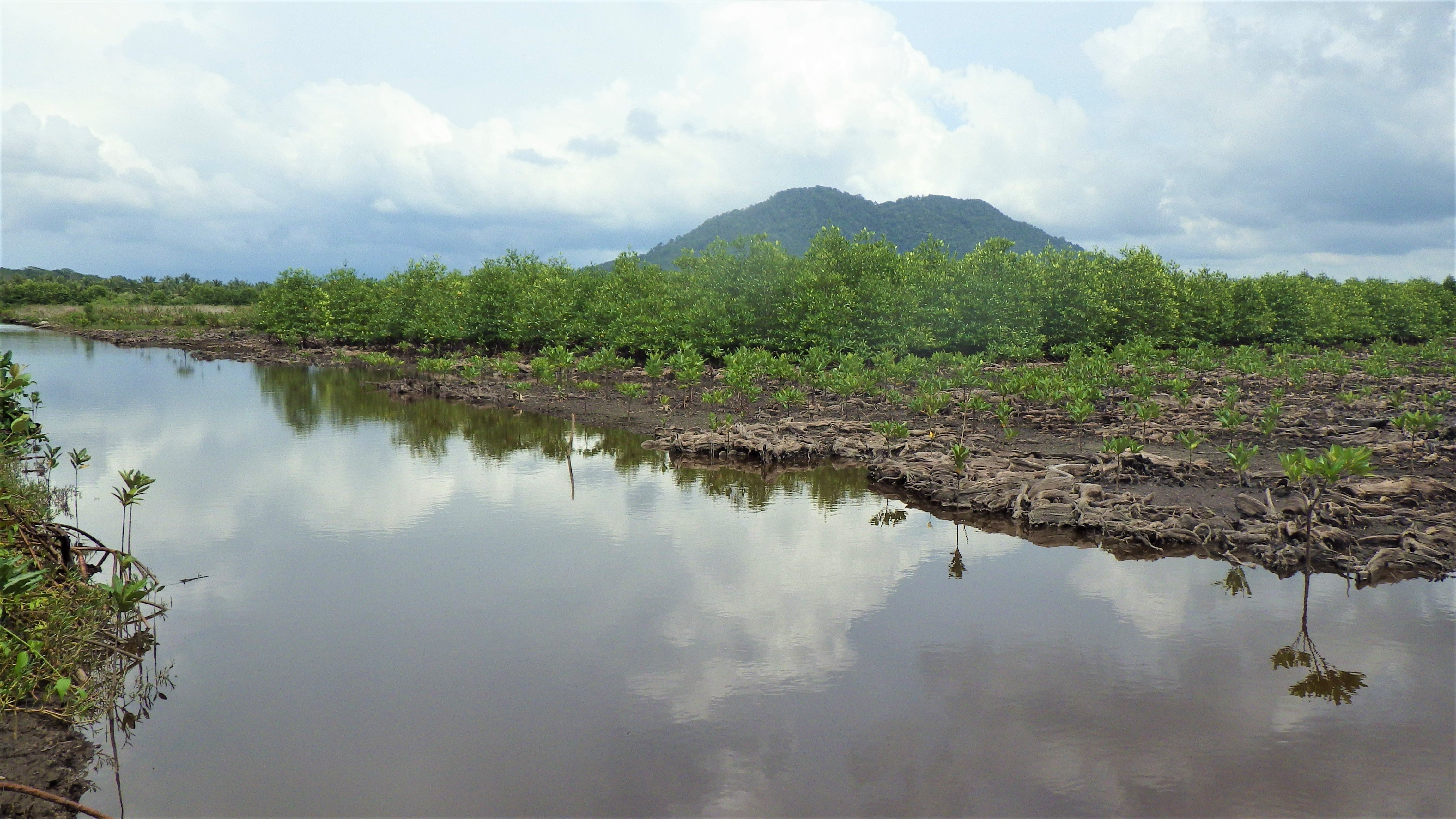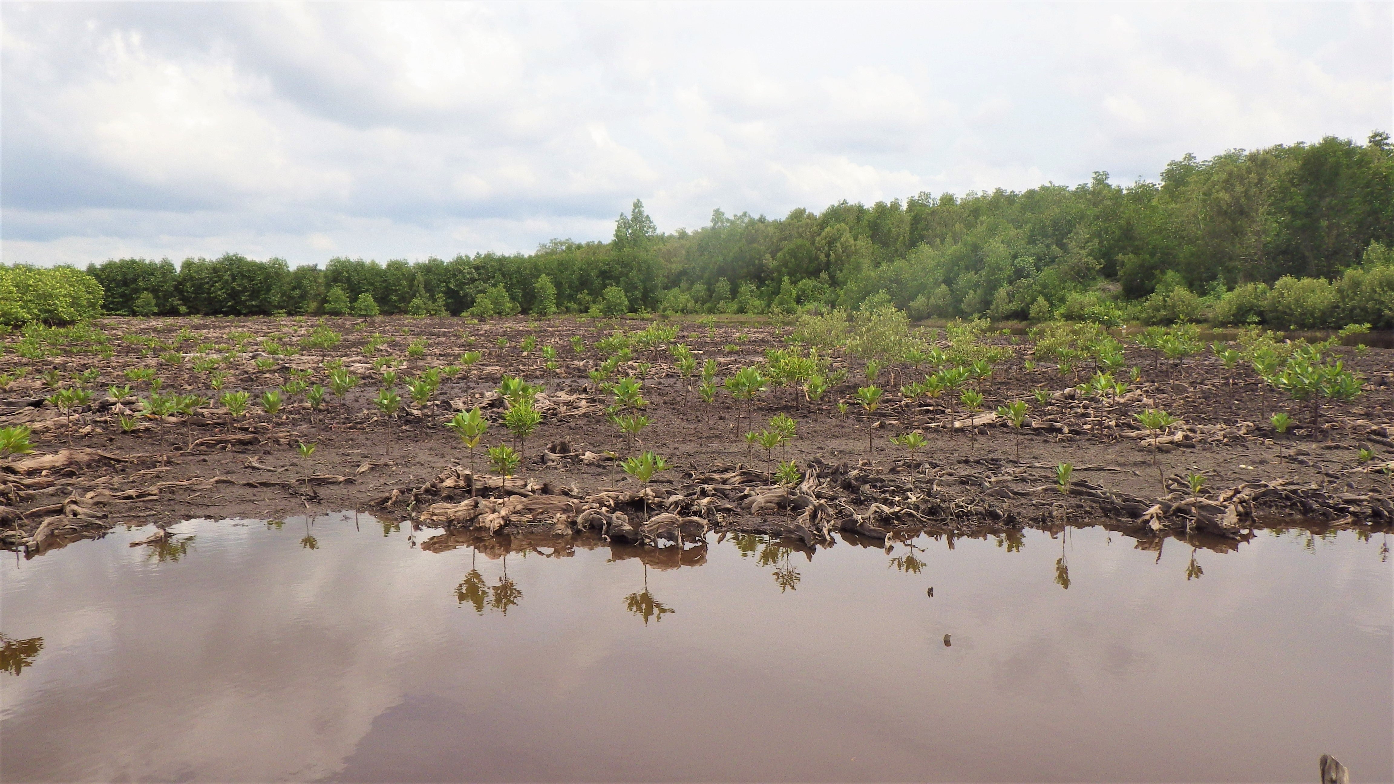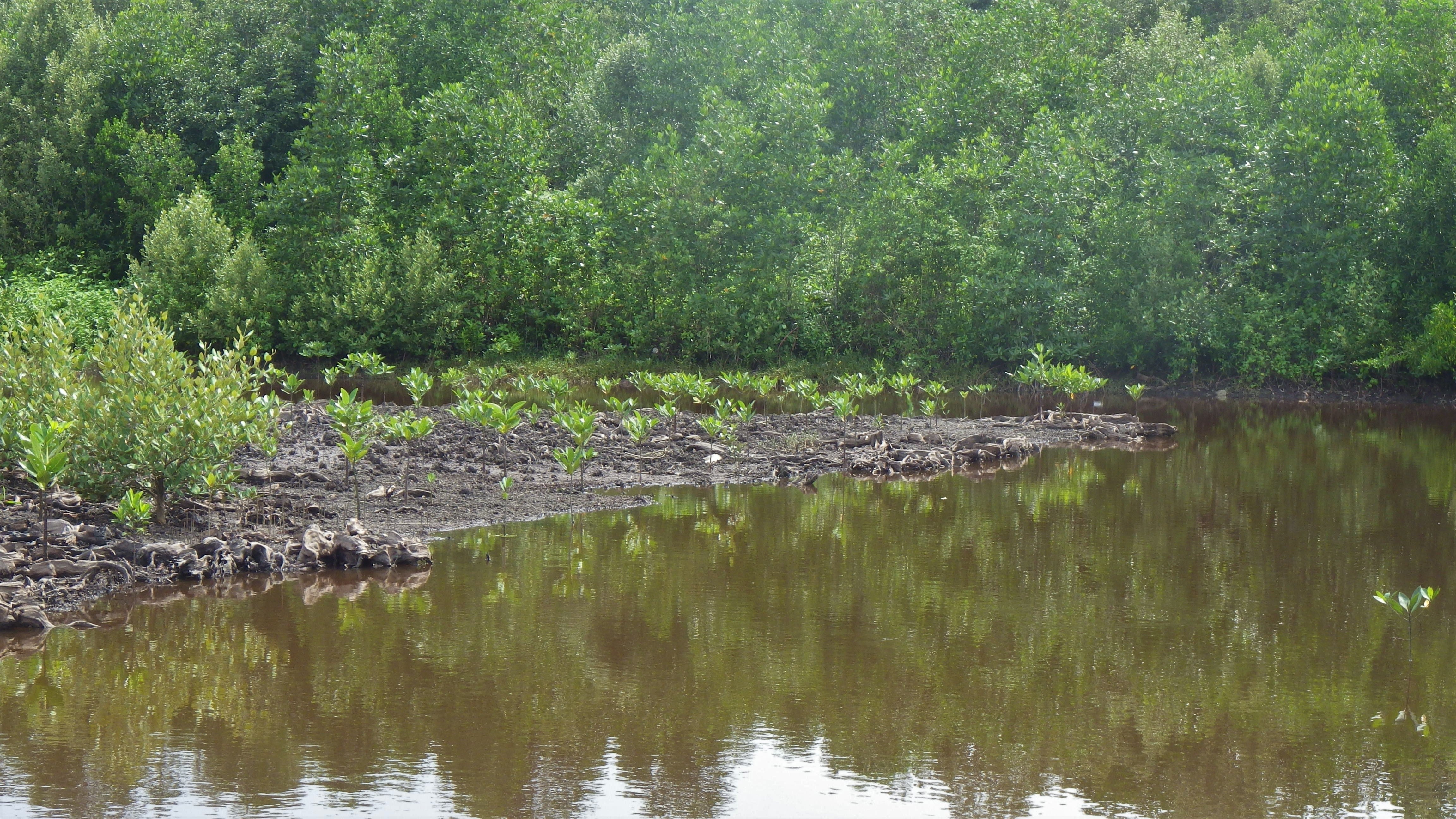 (奥に見える)この池の半分は3~4年前に植えられた先輩のマングローブ達がすくすくと育っています。