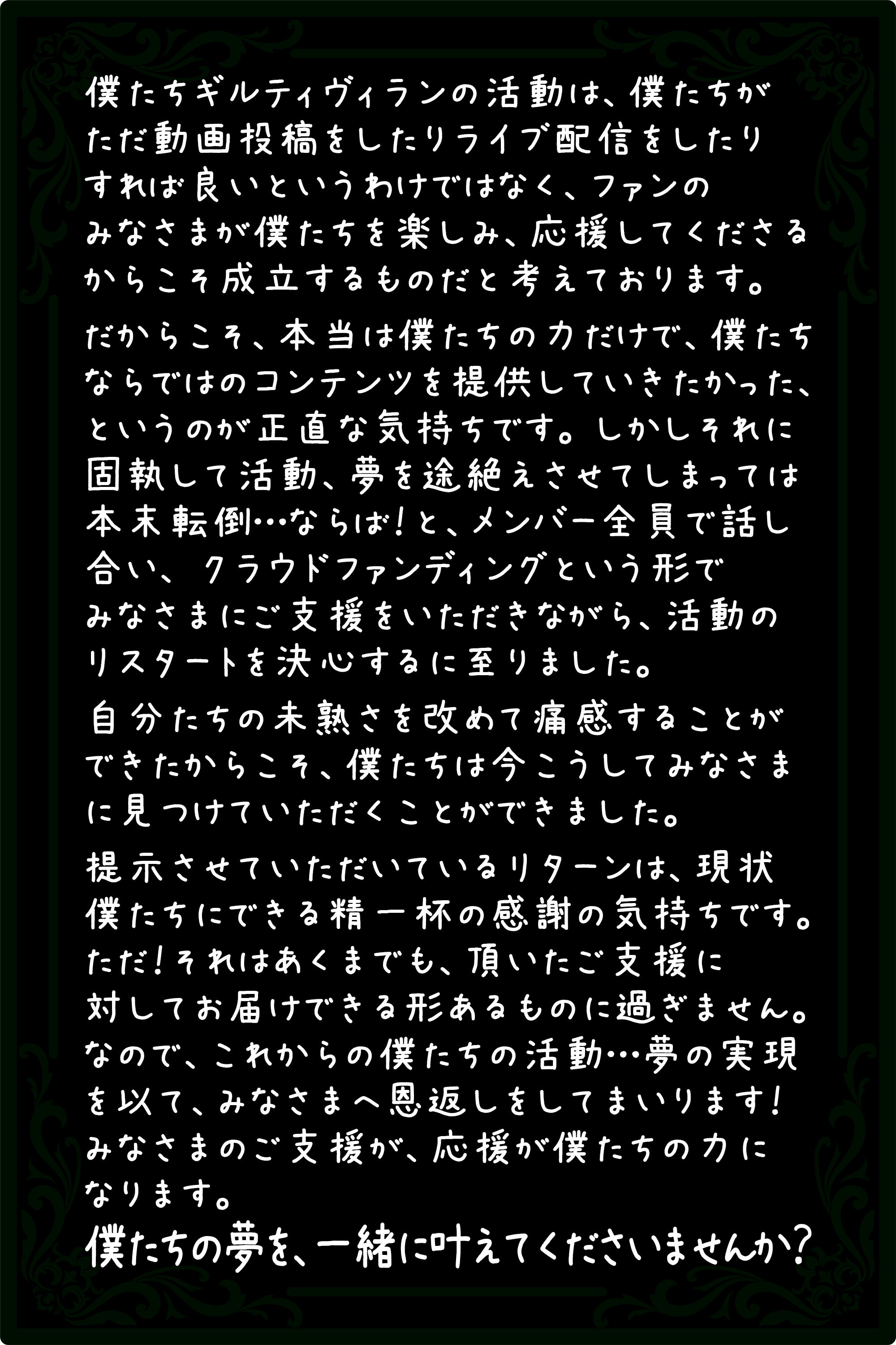 ですが現状、僕たちが持ちうるもののみでは実現することが難しく、悶々とした日々を過ごしております。 そこで今回、こうして僕たちを見つけてくださったみなさまに、これからの僕たちを応援していただけたらと思い、 このプロジェクトを企画致しました!