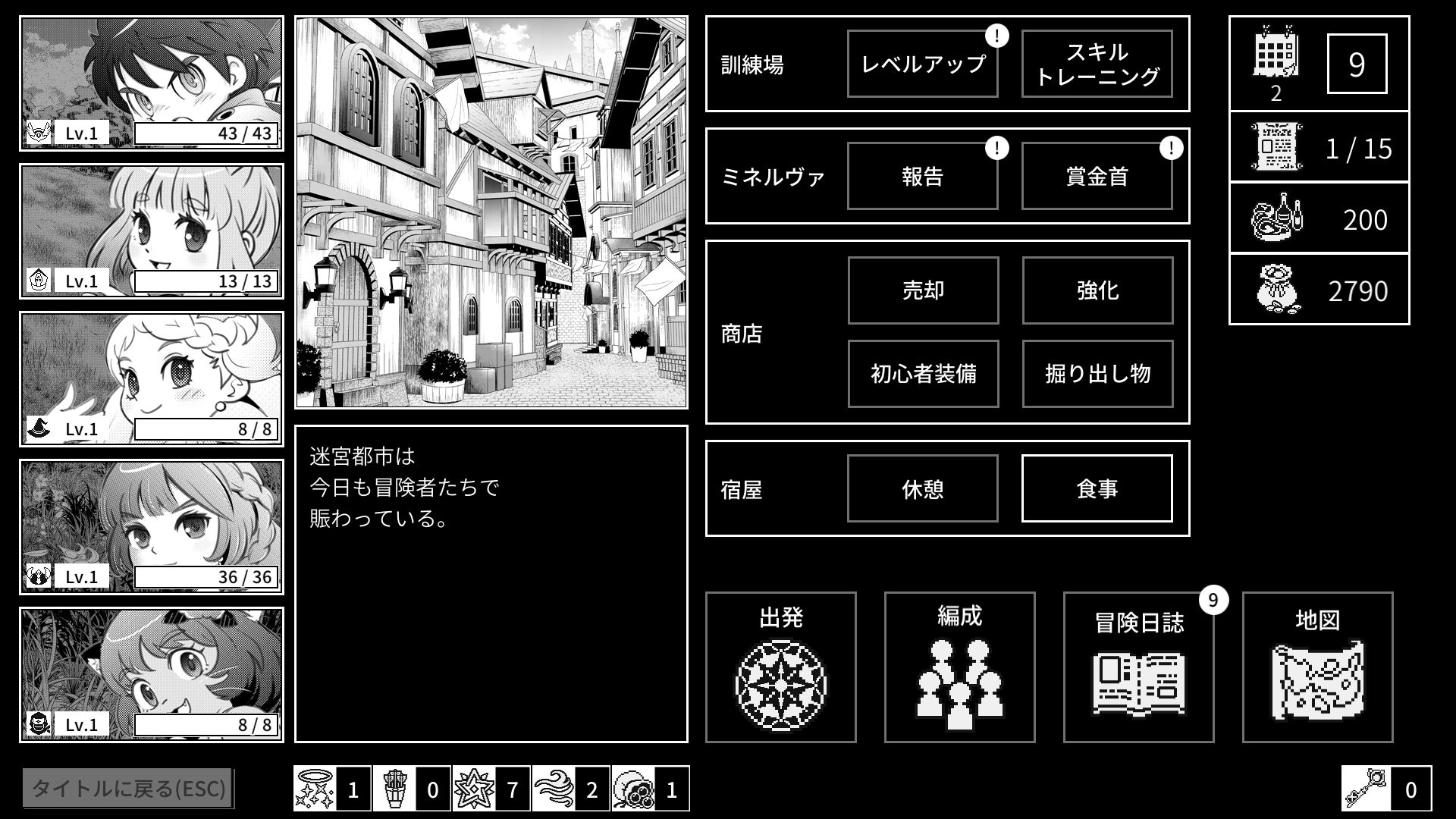 追伸:レイアウトを調整して【食事】メニューをつけました。冒険のヒントが聞けるようになるようになるかも……。また、【初心者装備】も改善要望が多かったので、調整を行っております。