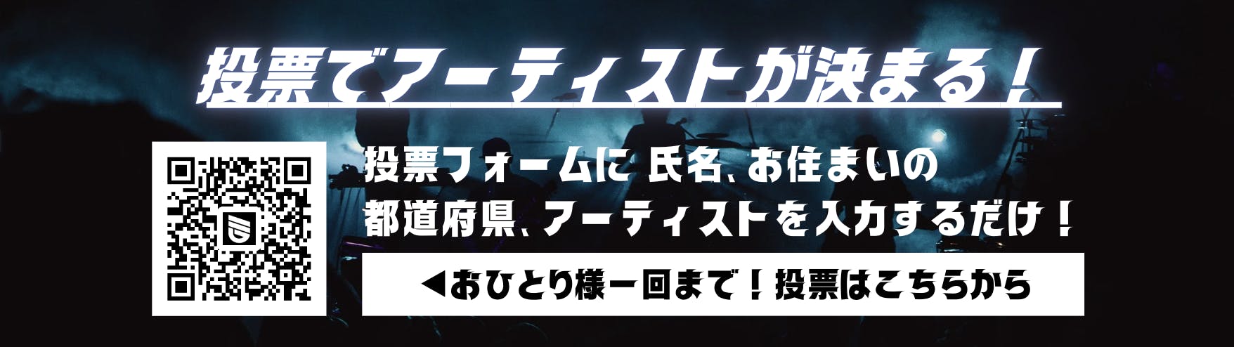 Googleフォームにて各地域ごとにアーティスト投票を行います!!各地域の出演アーティストは投票が多かった2〜3組となります。あなたの一票が大きなチャンスに!投票をして好きなアーティストを呼ぼう!!