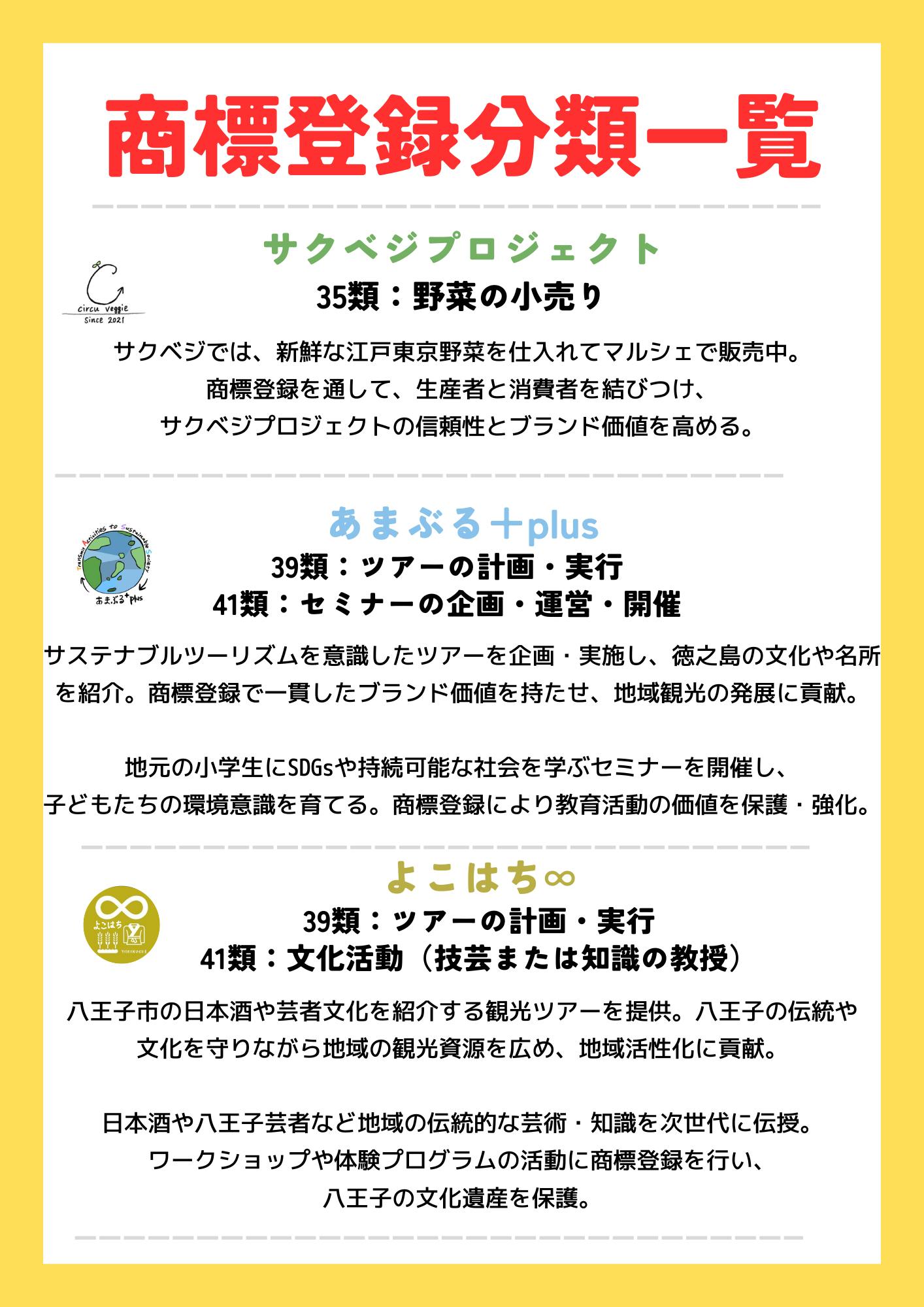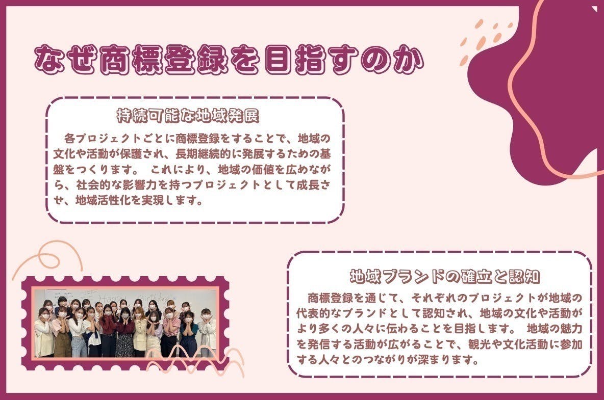 各プロジェクトを商標登録することで、地域の文化や活動が保護され、長期的に発展するための基盤となります。これにより、地域の価値を広めながら、社会的な影響力を持つプロジェクトとして成長させ、地域活性化を実現します。